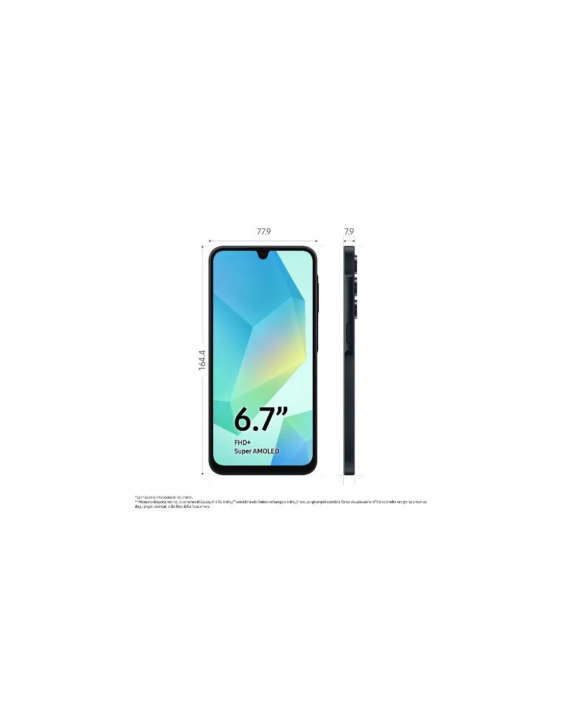 1_Le dimensioni dello schermo misurate diagonalmente sono di 6,7” come rettangolo pieno e di 6,5” considerando gli angoli stondati. Il foro della fotocamera e gli angoli stondati riducono l'area visualizzabile effettiva.