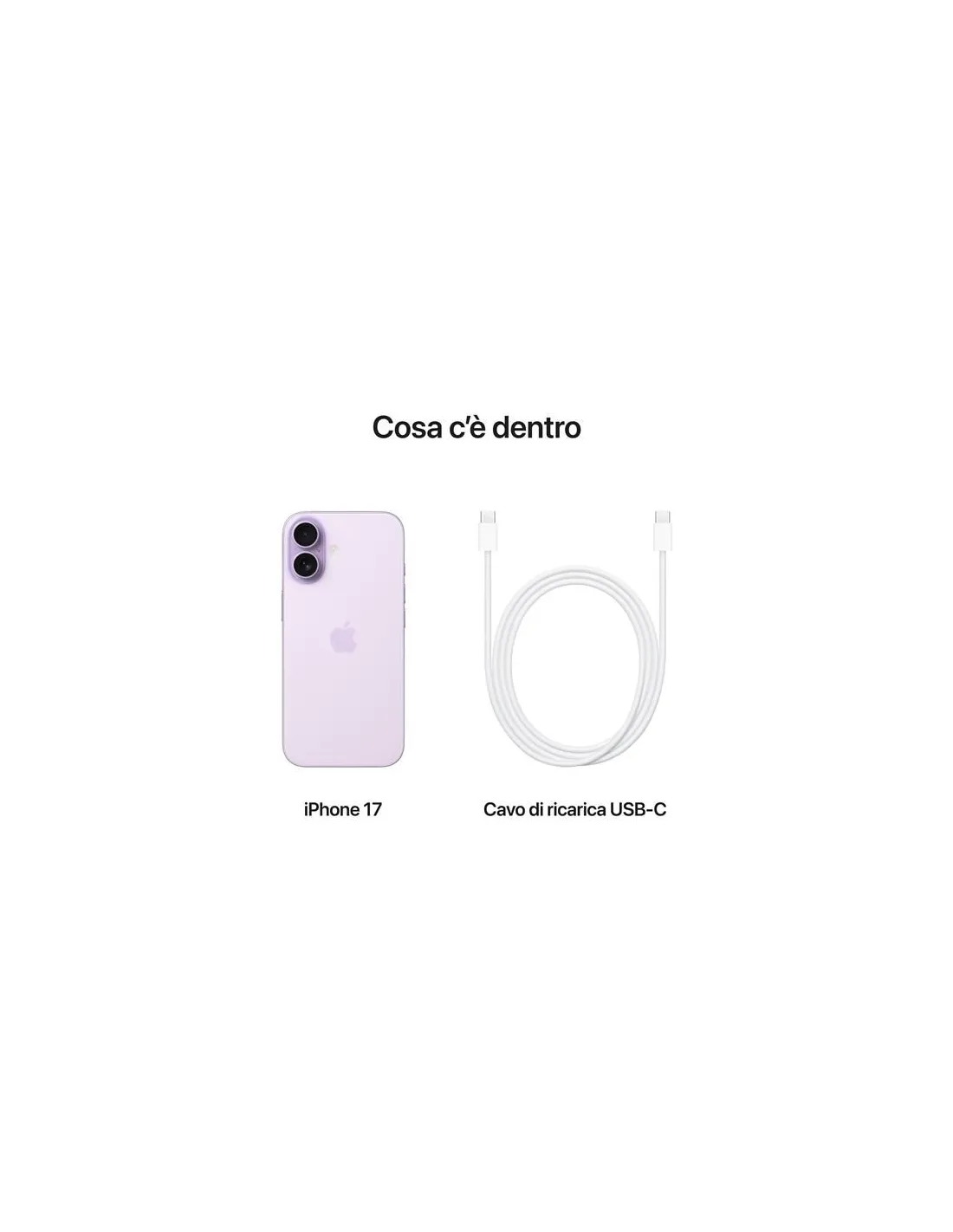Apple iPhone 17 256GB LavandaFantasticolor.iPhone 17. Sempre più bello. Sempre più robusto. Display ProMotion da 6,3", Ceramic Shield 2, fotocamere posteriori tutte da 48MP, fotocamera frontale Center Stage, chip A19 e molto altro.Caratteristiche principali- NATO PER PIACERE, FATTO PER DURARE — iPhone 17 è disponibile in cinque splendidi colori, ha un display da 6,3" più luminoso e la parte frontale in Ceramic Shield 2, tre volte più resistente ai graffi.- DISPLAY DA 6,3" CON PROMOTION: PIÙ LUMINOSO E BRILLANTE — Con la tecnologia ProMotion fino a 120Hz tutto scorre alla grande, e 3000 nit di luminosità di picco garantiscono un contrasto migliore all’aperto. E il display ha il 33% di riflessi in meno.- FOTO STREPITOSE — Foto ad altissima risoluzione per impostazione predefinita, grazie al sistema a doppia fotocamera Fusion da 48MP con zoom 2x di qualità ottica e ultra-grandangolo Fusion da 48MP.- FOTOCAMERA FRONTALE CENTER STAGE DA 18MP — Ancora più modi per trovare l’inquadratura giusta. Selfie di gruppo più facili, video con Acquisizione doppia per riprendere in simultanea te e la scena che hai davanti. E molto altro.- CHIP A19: UN CAMPIONE CHE SA DOSARE LE ENERGIE — Con una GPU 5 core, il Neural Engine migliorato scatena Apple Intelligence, i giochi più evoluti e tutto quel che fai sul tuo iPhone.- MINUTI PER RICARICARE, ORE PER CIÒ CHE VUOI FARE — La batteria dura tutto il giorno e ti dà fino a 30 ore di riproduzione video. E bastano 20 minuti per ricaricare fino al 50%.- iOS 26: L’ASPETTO CAMBIA, LA MAGIA AUMENTA — Liquid Glass. Il nuovo, bellissimo design che rende la tua esperienza d’uso più uniforme e ti farà subito sentire a casa. Con una schermata di blocco più d’impatto, sondaggi e sfondi personalizzabili in Messaggi, Filtro delle chiamate e molto altro.- PROGETTATO PER APPLE INTELLIGENCE – Fa di tutto per te, tenendo tutto per sé. Scrivere, creare e far tutto ciò che vuoi ora è più facile che mai.- FUNZIONI VIA SATELLITE — Se non c’è campo o non si sono reti Wi-Fi disponibili, puoi usare SOS emergenze via satellite. E in caso di grave incidente d’auto, iPhone può chiamare i soccorsi se tu non puoi.- UNA CONNESSIONE MIGLIORE, UNA VELOCITÀ SUPERIORE — Con il Wi-Fi 7, il 5G, il Bluetooth 6 e l’eSIM puoi contare su connessioni più veloci e sicure.- eSIM: SEMPLICE, VERSATILE, SICURA — È una tecnologia più comoda e flessibile che ti offre maggiore sicurezza e una connessione senza intoppi, ideale quando viaggi all’estero.- PRIVACY — Un nuovo livello di privacy e sicurezza. Di serie.Fotocamera frontale Center Stage da 18MP. Tutta un’altra posa.Un nuovissimo sensore quadrato ti permette di zoomare e ruotare a piacimento. Così, quando scatti un selfie o giri un video, l’inquadratura è sempre perfetta. E include automaticamente tutti i soggetti quando fai le foto di gruppo.Fotocamere posteriori tutte da 48MP. Uno scatto evolutivo.iPhone 17 ha una fotocamera principale Fusion da 48MP con teleobiettivo 2x di qualità ottica, e un ultra-grandangolo Fusion da 48MP. Quest’ultimo ha il quadruplo della risoluzione rispetto a quello di iPhone 16 e ora scatta di default foto da 24MP: la dimensione ideale per conservare e condividere versioni di alta qualità. Così, da vicino o da lontano, al chiuso o all’aperto, in pieno sole o con poca luce, avrai sempre foto spettacolari ad altissima risoluzione. E con l’archiviazione base che parte da 256GB, cioè il doppio dello spazio iniziale rispetto al modello precedente, puoi scattare come se non ci fosse un domani.Teleobiettivo 2xAllarga l’inquadratura o ingrandisci con lo zoom: avrai sempre dettagli incredibili.RipulisciRimuovi oggetti, persone e altri elementi indesiderati dalle tue fotoFoto con poca luce e in modalità NotteCattura immagini più nitide, dettagliate e luminose, con colori naturali e disturbo ridotto, anche quando è buio.Stili fotografici di nuova generazioneScegli uno dei vari stili predefiniti, come il nuovo Luminoso, per personalizzare la tonalità, il colore e l’aspetto generale delle tue foto.MacroScatta primissimi piani d’effetto catturando ogni minimo dettaglio in modo incredibilmente nitido.Video di livello professionaleRegistra video fino a 4K a 60 fps oppure attiva la modalità Cinema per risultati da film. E con Mix audio puoi regolare il suono delle voci nei tuoi video.Chip A19. Una batteria che dura tutto il giorno. Un campione che sa dosare le energie.Il chip A19 è il motore di tutto quello che fai sul tuo iPhone. Rende possibili funzioni di Apple Intelligence come Traduzione in tempo reale e Image Playground, e grazie alla tecnologia ProMotion manda in orbita anche i giochi AAA più evoluti. Con un’autonomia che dura tutto il giorno puoi lavorare, guardare video e restare fuori casa senza pensieri. E se vai di fretta, bastano 10 minuti di carica per avere fino a 8 ore di riproduzione video quando usi un alimentatore ad alta potenza.La famiglia iPhone. Tutto quello che cercavi. E quello che non immaginavi.Ci sono tantissimi motivi per amare i nuovi iPhone. Apple Intelligence e le sue funzioni utili, come l’intelligenza visiva e gli Strumenti di scrittura, ti semplificano la vita ogni giorno. Le connessioni sono veloci e sicure grazie al Wi-Fi 7, al Bluetooth, alla connettività 5G e all’eSIM.Liquid GlassIl nuovo design di iOS riflette e rifrange in tempo reale le immagini sottostanti, adattandosi in maniera dinamica ai tuoi contenuti tra app e dispositivi diversi.Una schermata di blocco più d’impattoL’ora si adatta dinamicamente alla foto sullo sfondo e alle notifiche, in modo che il soggetto dell’immagine non venga mai coperto. E quando muovi l’iPhone, l’immagine prende vita con un nuovo effetto 3D.Sondaggi in MessaggiCrea un sondaggio all’interno di una conversazione, e tutti i contatti presenti potranno partecipare e tenere d’occhio i voti man mano che arrivano.Intelligenza visivaInquadra qualcosa con la foto