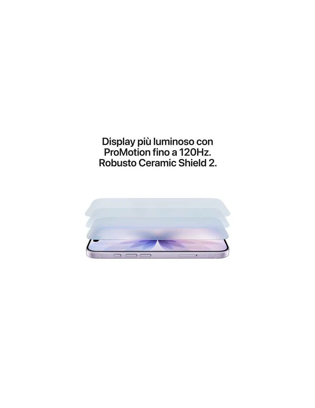 - DISPLAY DA 6,3" CON PROMOTION: PIÙ LUMINOSO E BRILLANTE — Con la tecnologia ProMotion fino a 120Hz tutto scorre alla grande, e 3000 nit di luminosità di picco garantiscono un contrasto migliore all’aperto. E il display ha il 33% di riflessi in meno.