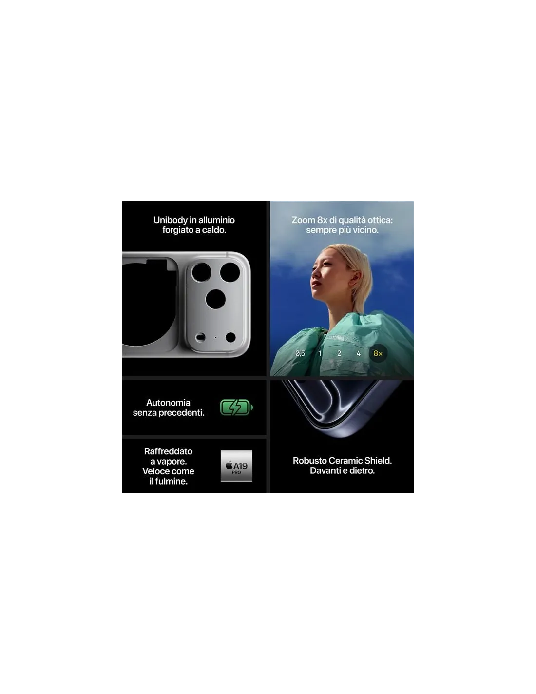 Dolby Vision 4K a 120 fps. Offre una qualità cinematografica straordinaria grazie a un mix di alta risoluzione e frame rate più elevati.Un nuovo concetto di potenza.Grazie a un’evoluta tecnologia di raffreddamento, iPhone 17 Pro offre prestazioni fulminee per lavorare a progetti dalla grafica complessa o a file multimediali di grandi dimensioni. Apple ha progettato una camera di vapore saldata a laser che, in combinazione con la struttura unibody in alluminio, contribuisce a proteggere il chip A19 Pro dal calore e a garantire prestazioni ancora più elevate per un tempo prolungato. E proprio questa gestione termica rivoluzionaria ci ha permesso di creare l’iPhone più potente di sempre.Batteria a oltranza.Il nuovo design interno di iPhone 17 Pro Max aumenta in modo significativo lo spazio per la batteria, per darti la migliore autonomia mai vista su un iPhone: una carica completa dura fino a 3 ore in più rispetto ad iPhone 15 Pro Max. Se devi lavorare fino a tardi o vuoi fare una scorpacciata di video, sarà sempre pronto a fare gli straordinari.Tutto quello che cercavi. E quello che non immaginavi.I nuovi modelli di iPhone sono strapieni di tecnologie evolute. Apple Intelligence ti semplifica la vita ogni giorno con funzioni come l’intelligenza visiva e gli Strumenti di scrittura. E Wi-Fi 7, Bluetooth 6, connettività 5G e eSIM ti danno connessioni più veloci e sicure.iOS 26. L’aspetto cambia. La magia aumenta.Liquid Glass. Il nuovo design di iOS riflette e rifrange in tempo reale le immagini sottostanti, adattandosi in modo fluido ai tuoi contenuti tra app e dispositivi diversi.