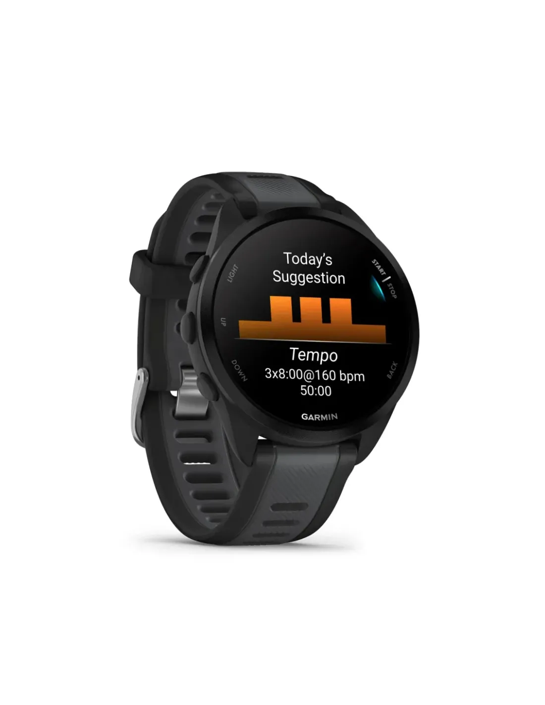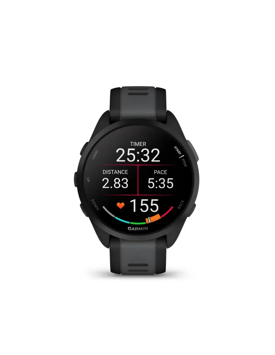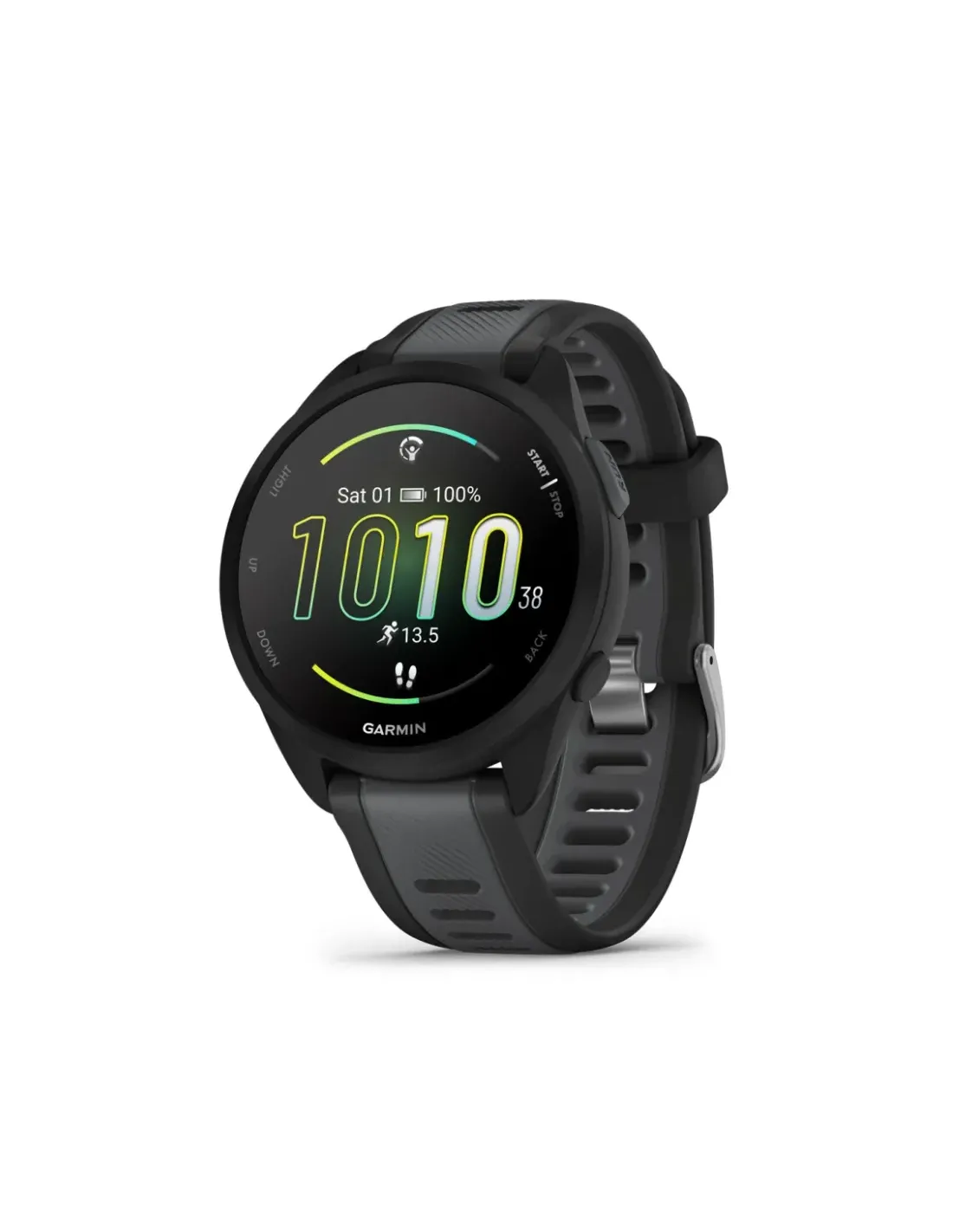Garmin Forerunner 165. Dimensioni diagonale schermo: 3,05 cm (1.2"), Tecnologia display: AMOLED, Risoluzione del display: 390 x 390 Pixel, Touch screen. Memoria flash: 4 GB. GPS (satellitare). Peso: 39 g. Materiale cinturino: Silicone, Colore cinturino: Nero, Grigio
