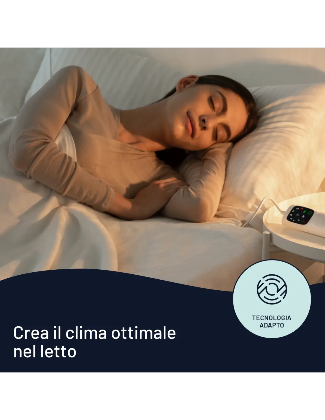 Scaldasonno Adapto ti garantisce un riposo ottimale perchè crea nel letto il tuo clima ideale e lo mantiene stabile tutta la notte autoregolandosi sulle tue esigenze.