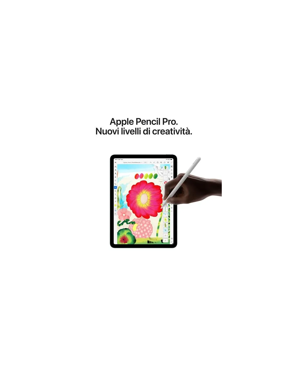 Il nuovo modem cellulare C1X supporta velocità dati fino al 50% superiori con una maggiore efficienza e con una copertura 5G globale. In questo modo puoi accedere ai tuoi file, comunicare con chi lavora con te e fare il backup dei tuoi dati ovunque tu sia.8 E con l’eSIM puoi attivare un piano dati cellulare direttamente sul tuo dispositivo in modo veloce, comodo e sicuro.Apple Pencil Pro. Creata per creare senza limiti.Disegna, dipingi, prendi appunti: Apple Pencil rende tutto più facile e intuitivo, come per magia. È precisa al pixel, ha una bassa latenza, cambia il tratto in base all’inclinazione. Mentre la usi puoi appoggiare la mano sullo schermo, proprio come faresti su un foglio. E Apple Pencil Pro ha una serie di funzioni ancora più evolute per aiutarti a dare vita alle tue idee.Magic Keyboard. Batti sui tasti giusti.La Magic Keyboard è l’anima gemella di iPad Air. È disponibile in nero o bianco. Elegante e portatile, è comodissima per scrivere e il suo trackpad è perfetto per i lavori che richiedono grande precisione. Ha anche 14 tasti funzione, un connettore USB-C per la ricarica pass-through e, quando è chiusa, protegge il tuo iPad Air davanti e dietro. Il design a inclinazione libera ti permette di regolare l’angolazione proprio come vuoi e, grazie all’ampio trackpad in vetro, puoi interagire con iPadOS in modi nuovi.Fotocamere. Fai scattare la tua immaginazione.Con la videocamera frontale e la fotocamera posteriore di ultima generazione, puoi fare foto o riprese mozzafiato e ritoccarle in un attimo. Puoi registrare contenuti audio con i due microfoni integrati e riprodurre un suono ricco e avvolgente con gli altoparlanti stereo in orizzontale. E grazie alla funzione “Inquadratura automatica”, le tue videochiamate sono più dinamiche.