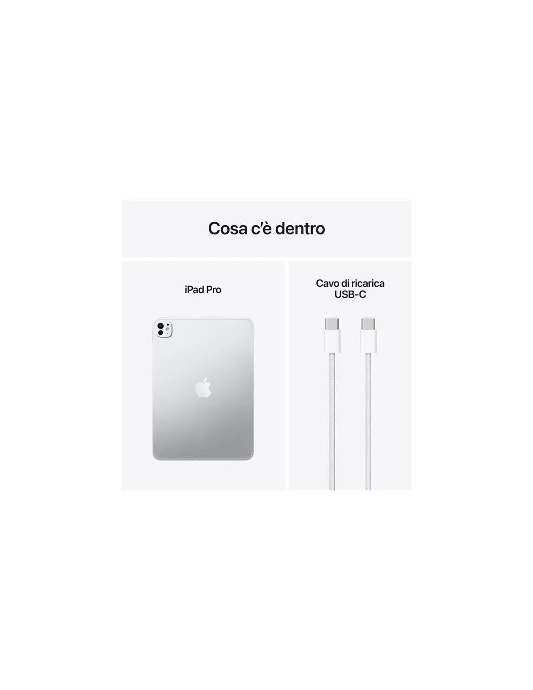 Apple iPad Pro 11" Wi-Fi + Cellular 256GB display standard ArgentoiPad Pro. Progettati per Apple Intelligence.iPad Pro. Progettato per Apple Intelligence. iPad Pro sfrutta la potenza del chip Apple M5 e ti offre prestazioni esagerate per una produttività al quadrato e flussi di lavoro evoluti basati sull’intelligenza artificiale. Con lo spettacolare display Ultra Retina XDR, il Wi Fi 7 ultrarapido, la connettività 5G, i Neural Accelerator per le attività AI e iPadOS riprogettato, il tuo iPad Pro è pronto a tutto. Se poi lo abbini a Apple Pencil Pro e alla Magic Keyboard, hai a portata di mano infinite possibilità per creare, lavorare e fare quello che ti piace di più.Caratteristiche principali- PERFORMANCE E SPAZIO DI ARCHIVIAZIONE — iPad Pro con chip M5 ha una velocità mai vista e la potenza dell’AI on device per tutto quello che fai. Ti dà fino a 2TB di archiviazione, 16GB di memoria e i Neural Accelerator per prestazioni AI di livello superiore.- IPADOS — Su iPadOS 26 le tue app professionali girano a meraviglia. In più, il suo design Liquid Glass e le funzioni rivoluzionarie fanno aumentare la tua produttività, e grazie al sistema di gestione finestre intuitivo e flessibile organizzi i tuoi flussi di lavoro come mai prima d’ora. - APPLE INTELLIGENCE — Apple Intelligence è il sistema di intelligenza personale che rende più facile comunicare, creare e fare tutto ciò che vuoi, con funzioni di ultima generazione per la tutela della privacy.- DISPLAY ULTRA RETINA XDR DA 11" — Il display più evoluto al mondo ti offre luminosità estrema, contrasto preciso, ProMotion, ampia gamma cromatica P3 e True Tone. Il vetro con nanotexture è disponibile su richiesta per i modelli da 1TB e 2TB, per darti una resa ottimale anche nelle condizioni di illuminazione più difficili.- APPLE PENCIL E MAGIC KEYBOARD PER IPAD PRO — Con Apple Pencil Pro e Apple Pencil (USB-C) puoi disegnare, prendere appunti e creare in modo preciso e intuitivo. La Magic Keyboard è comodissima per scrivere e ha un trackpad con feedback aptico.- FOTOCAMERE EVOLUTE — iPad Pro ha una videocamera orizzontale Center Stage da 12MP e una fotocamera da 12MP con grandangolo e flash True Tone adattivo. I quattro microfoni di qualità professionale e il sistema audio a quattro altoparlanti offrono un suono ricco e potente.- CONNETTIVITÀ — Grazie al Wi Fi 7 con chip Apple N1 puoi trasferire foto, documenti e video di grandi dimensioni rapidamente e in tutta sicurezza. E con Apple C1X hai il velocissimo 5G per rimanere in contatto col mondo in ancora più posti.- SBLOCCA E PAGA CON FACE ID — Sblocca il tuo iPad Pro, paga i tuoi acquisti in tutta sicurezza e accedi alle app, con un semplice sguardo.M5. Creatore di velocità.Il chip M5 spinge ancora più avanti le capacità di iPad Pro, che ora ti dà un’efficienza mai vista e performance straordinarie. La GPU 10-core di ultima generazione con i nuovi, potenti Neural Accelerator fa spiccare il volo alle attività basate su AI, dalla creazione dei token per i large language model (LLM) alla generazione di immagini. E tu puoi lavorare alla velocità della luce grazie alle prestazioni multi-thread della CPU e alla memoria ancora più rapida.iPadOS e le app. La squadra è all’opera.Il nuovo, splendido design con Liquid Glass è solo una delle tante incredibili innovazioni di iPadOS 26 che portano le capacità di iPad Pro a un livello mai visto. Il sistema di gestione delle finestre è stato riprogettato per offrirti ancora più flessibilità ed efficienza. Puoi usare app professionali, lanciarti in giochi ad alte prestazioni e affrontare ogni progetto creativo con un’interfaccia intuitiva, pensata per i gesti touch.Apple Intelligence. Ci dà dentro anche per te.iPad Pro è progettato per Apple Intelligence. Ti permette di creare, comunicare e fare tutto ciò che vuoi, sempre con un eccezionale livello di privacy.Ultra Retina XDR. Il display più evoluto al mondo.Il display Ultra Retina XDR porta con sé la rivoluzionaria tecnologia OLED tandem, che ti offre una luminosità incredibile, un contrasto eccezionale e una gamma dinamica estrema. Tecnologie evolute come ProMotion e True Tone ti fanno vivere un’esperienza visiva stupefacente. E per lavori che richiedono una particolare accuratezza cromatica, puoi usare la modalità Riferimento.Design. Una potenza senza confini.Pur essendo incredibilmente leggero e sottile, iPad Pro offre una potenza straordinaria e un giorno intero di autonomia per fare ancora più cose. E con la ricarica rapida la batteria arriva fino al 50% in circa 30 minuti.Apple Pencil Pro. Creata per creare senza limiti.Disegna, dipingi, prendi appunti: Apple Pencil rende tutto più intuitivo, più facile, quasi magico. È precisa al pixel, ha una bassa latenza, cambia il tratto in base all’inclinazione, e mentre la usi puoi appoggiare la mano sullo schermo, proprio come faresti su un foglio.