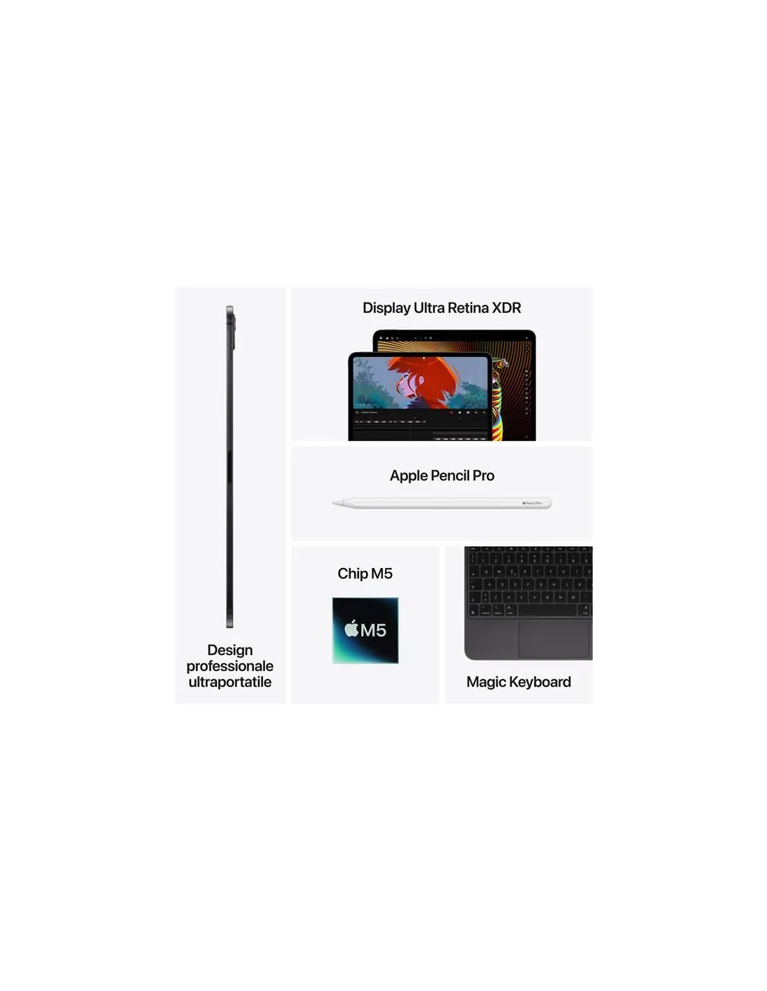 E Apple Pencil Pro ha una serie di funzioni ancora più evolute per aiutarti a dare vita alle tue idee.Magic Keyboard. Che strumenti di precisione, le tue dita.La Magic Keyboard è una tastiera dal design elegante e portatile che rende ancora più piacevole l’uso dei tasti e del trackpad integrato. L’appoggio in alluminio per le mani ti dà un’ulteriore comodità, mentre una fila di tasti funzione e un trackpad in vetro più ampio con feedback aptico ti permettono di lavorare con precisione e usare i gesti Multi-Touch.Microfono. Fotocamere. E azione.Scatta, filma, ritocca e condividi, tutto da un unico dispositivo: hai a disposizione un sistema di fotocamere Pro con scanner LiDAR, microfoni di qualità professionale e quattro altoparlanti. Gira video ProRes 4K, registra un podcast e scegli il microfono giusto per ogni app con il selettore di input.Wi-Fi e Cellular. Connessioni prêt-à-porter.Le prestazioni e l’affidabilità del chip wireless N1 ti consentono di lavorare ovunque ti trovi, con Wi-Fi 7, Bluetooth 6 e Thread.