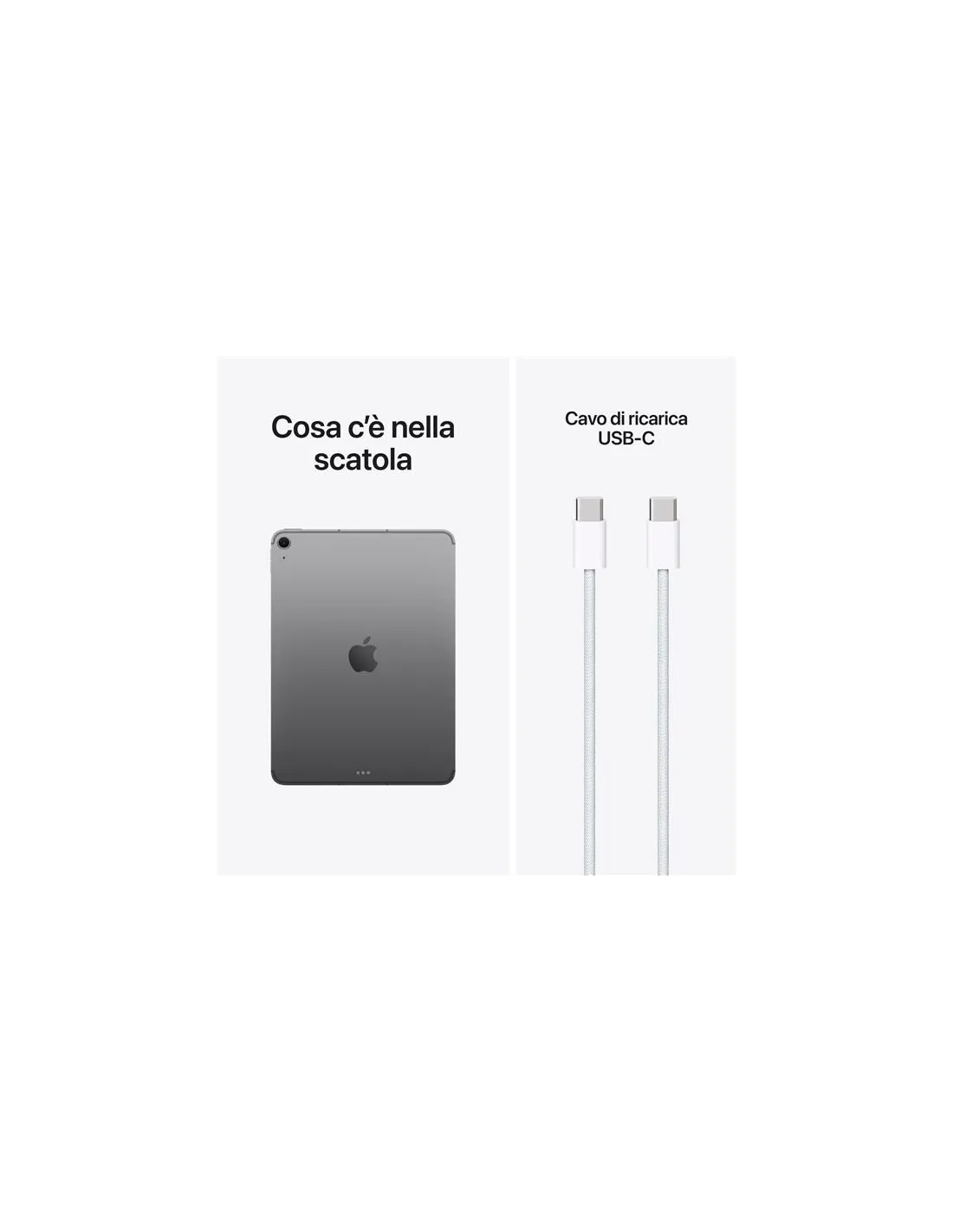 Apple iPad Air 11'' Wi-Fi + Cellular 512GB - Grigio SideraleiPad Air. Progettati per Apple Intelligence.iPad Air 11". Progettato per Apple Intelligence. iPad Air, ora con i superpoteri di M4. Incredibile, nelle prestazioni e nel prezzo. Ha uno splendido display Liquid Retina, una videocamera frontale Center Stage da 12MP per videochiamate perfette, iPadOS e il Wi Fi 7 e il 5G ultrarapidi. Inoltre puoi usarlo con Apple Pencil Pro, con la Magic Keyboard per iPad Air e con altri accessori, per lavorare, studiare, giocare e creare facilmente, anche in multitasking.Caratteristiche principali - PERCHÉ IPAD AIR – iPad Air con chip Apple M4 ti offre prestazioni ancora più scattanti e uno splendido design in due taglie superportatili. Ha le potenti funzioni di Apple Intelligence, uno spettacolare display Liquid Retina, Touch ID, fotocamere evolute e Wi Fi 7. - PERFORMANCE E SPAZIO DI ARCHIVIAZIONE – Il chip M4 ti dà una grafica evoluta e prestazioni straordinarie, per poter usare più app simultaneamente e gestire le attività AI più complesse. E con un giorno intero di autonomia, puoi continuare a lavorare e divertirti ovunque vai. Scegli fino a 1TB di archiviazione per app, musica, film e altro. - IPADOS + APP – Con le funzioni rivoluzionarie e il design intuitivo di iPadOS, le tue app girano a meraviglia e la tua produttività decolla. Il sistema flessibile di gestione delle finestre ti permette di organizzare e tenere sotto controllo ogni attività come mai prima d’ora. - APPLE INTELLIGENCE – Apple Intelligence è il sistema di intelligenza personale che rende più facile creare, comunicare e fare tutto ciò che vuoi, con funzioni di ultima generazione per la tutela della privacy. - DISPLAY LIQUID RETINA DA 11" – Lo splendido display Liquid Retina ha tecnologie evolute come il True Tone e l’ampia gamma cromatica P3, oltre a una riflettanza ridotta al minimo: per questo ti dà immagini assolutamente spettacolari. - CONNETTIVITÀ – Grazie al Wi Fi 7 con chip Apple N1 puoi trasferire in un attimo foto, documenti e video di grandi dimensioni. E con Apple C1X hai il velocissimo 5G per rimanere in contatto col mondo in ancora più posti. - APPLE PENCIL E MAGIC KEYBOARD PER IPAD AIR – Con Apple Pencil Pro e Apple Pencil (USB C) puoi disegnare, prendere appunti e creare in modo preciso e intuitivo. La Magic Keyboard è comodissima per scrivere e ha un trackpad con feedback aptico. - FOTOCAMERE EVOLUTE – iPad Air ha una videocamera frontale Center Stage da 12MP ideale per selfie e videochiamate. La fotocamera posteriore da 12MP con grandangolo invece è perfetta per fare scansioni di documenti, scattare foto e girare video 4K. - SBLOCCA E PAGA CON TOUCH ID – Con Touch ID ti basta un tocco per sbloccare l’iPad Air, accedere alle app e pagare i tuoi acquisti in totale sicurezza con Apple Pay.M4. La potenza va più suuuuu.Il velocissimo chip M4 ha il 50% di memoria unificata in più, così il tuo iPad Air sarà un fulmine in tutto. È un concentrato di potenza al servizio dell’intelligenza artificiale: le funzioni che usi ogni giorno ti aiuteranno a fare quello che vuoi in modo ancora più rapido ed efficiente. E l’architettura della GPU ti offre prestazioni grafiche fenomenali per lavorare, guardare video in streaming, creare o giocare. In più, ha una batteria che dura tutto il giorno: un’efficienza niente male, no?iPadOS e le app. Ora sì che si vola.Lo splendido design Liquid Glass dal look sorprendente è solo una delle tante incredibili innovazioni di iPadOS 26 che portano la produttività di iPad Air a un livello mai visto. Il sistema di gestione delle finestre è stato riprogettato per offrirti ancora più flessibilità ed efficienza. Puoi usare app professionali, lanciarti in giochi ad alte prestazioni e affrontare ogni progetto creativo con un’interfaccia immediata, pensata per i gesti touch.Apple Intelligence. Un aiuto sempre pronto per le cose di ogni giorno.iPad Air è progettato per Apple Intelligence, il sistema di intelligenza personale che rende più facile creare, comunicare e fare tutto ciò che vuoi. E grazie a funzioni di ultima generazione per la tutela della privacy, hai la certezza che nessuno potrà accedere ai tuoi dati, nemmeno Apple.