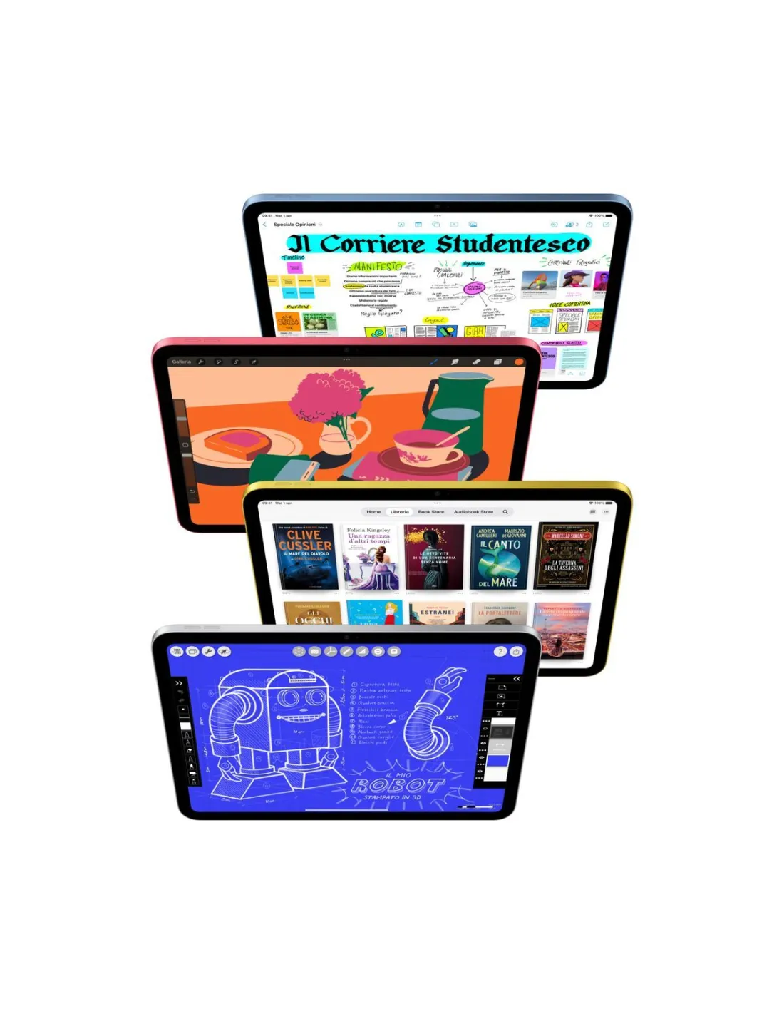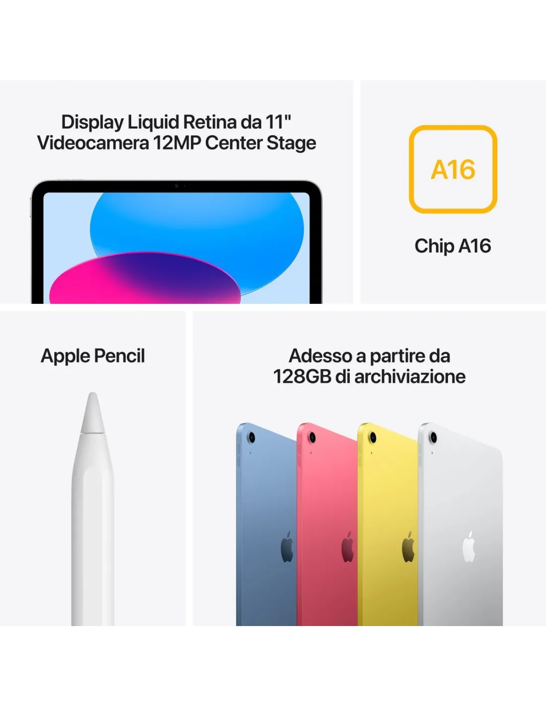 iPad ha uno spettacolare spettacolare display Liquid Retina con True Tone. Grazie anche al chip A16 ultraveloce e a iPadOS, è uno strumento eccezionale per creare, collaborare e fare tutto quello che ami. E con gli accessori pensati apposta per lui, c’è un mondo di nuove possibilità da esplorare.