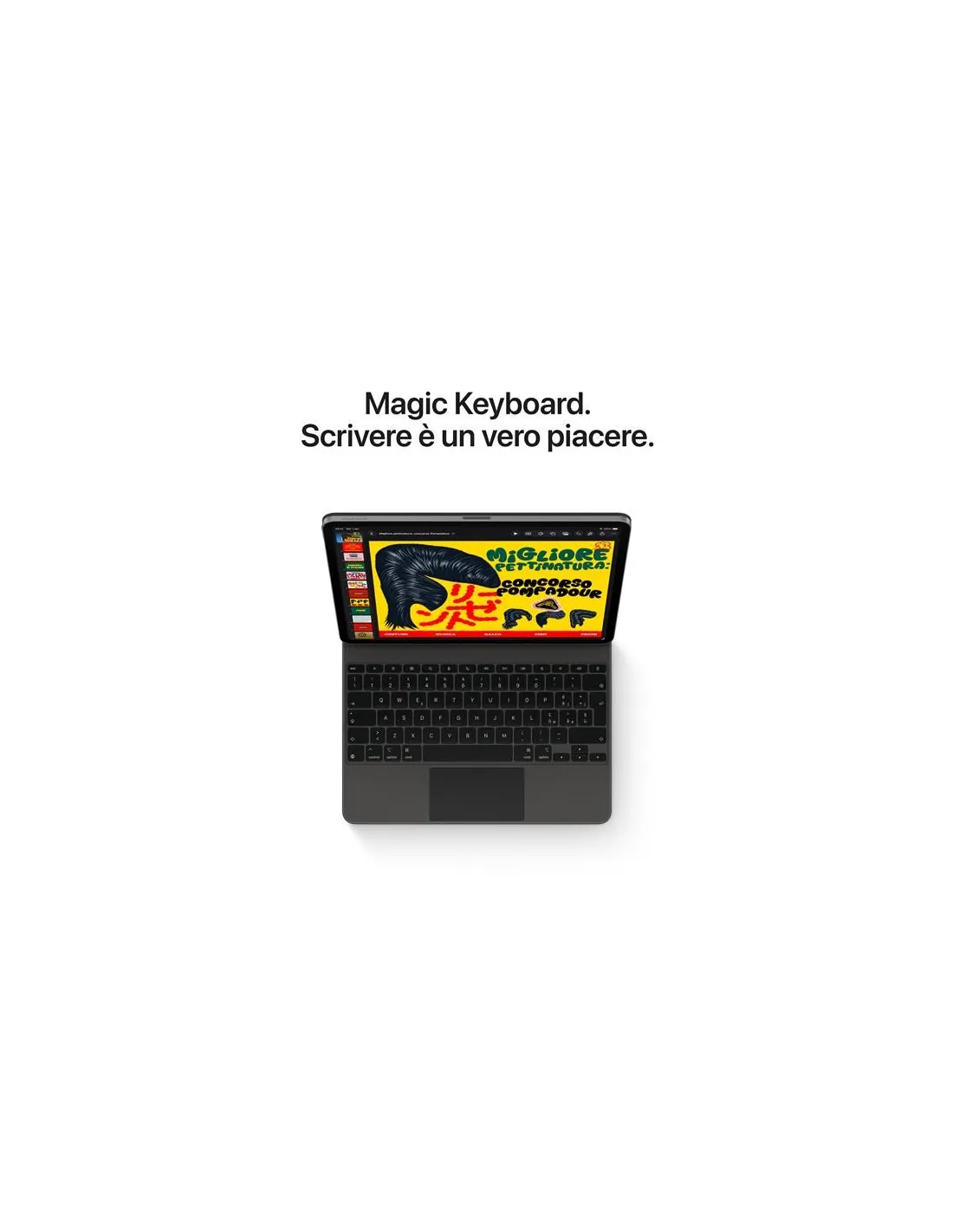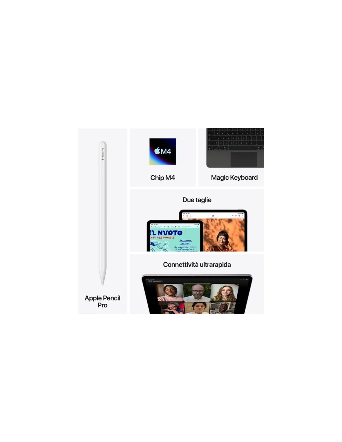 Il nuovo modem cellulare C1X supporta velocità dati fino al 50% superiori con una maggiore efficienza e con una copertura 5G globale. In questo modo puoi accedere ai tuoi file, comunicare con chi lavora con te e fare il backup dei tuoi dati ovunque tu sia.8 E con l’eSIM puoi attivare un piano dati cellulare direttamente sul tuo dispositivo in modo veloce, comodo e sicuro.Apple Pencil Pro. Creata per creare senza limiti.Disegna, dipingi, prendi appunti: Apple Pencil rende tutto più facile e intuitivo, come per magia. È precisa al pixel, ha una bassa latenza, cambia il tratto in base all’inclinazione. Mentre la usi puoi appoggiare la mano sullo schermo, proprio come faresti su un foglio. E Apple Pencil Pro ha una serie di funzioni ancora più evolute per aiutarti a dare vita alle tue idee.Magic Keyboard. Batti sui tasti giusti.La Magic Keyboard è l’anima gemella di iPad Air. È disponibile in nero o bianco. Elegante e portatile, è comodissima per scrivere e il suo trackpad è perfetto per i lavori che richiedono grande precisione. Ha anche 14 tasti funzione, un connettore USB-C per la ricarica pass-through e, quando è chiusa, protegge il tuo iPad Air davanti e dietro. Il design a inclinazione libera ti permette di regolare l’angolazione proprio come vuoi e, grazie all’ampio trackpad in vetro, puoi interagire con iPadOS in modi nuovi.Fotocamere. Fai scattare la tua immaginazione.Con la videocamera frontale e la fotocamera posteriore di ultima generazione, puoi fare foto o riprese mozzafiato e ritoccarle in un attimo. Puoi registrare contenuti audio con i due microfoni integrati e riprodurre un suono ricco e avvolgente con gli altoparlanti stereo in orizzontale. E grazie alla funzione “Inquadratura automatica”, le tue videochiamate sono più dinamiche.