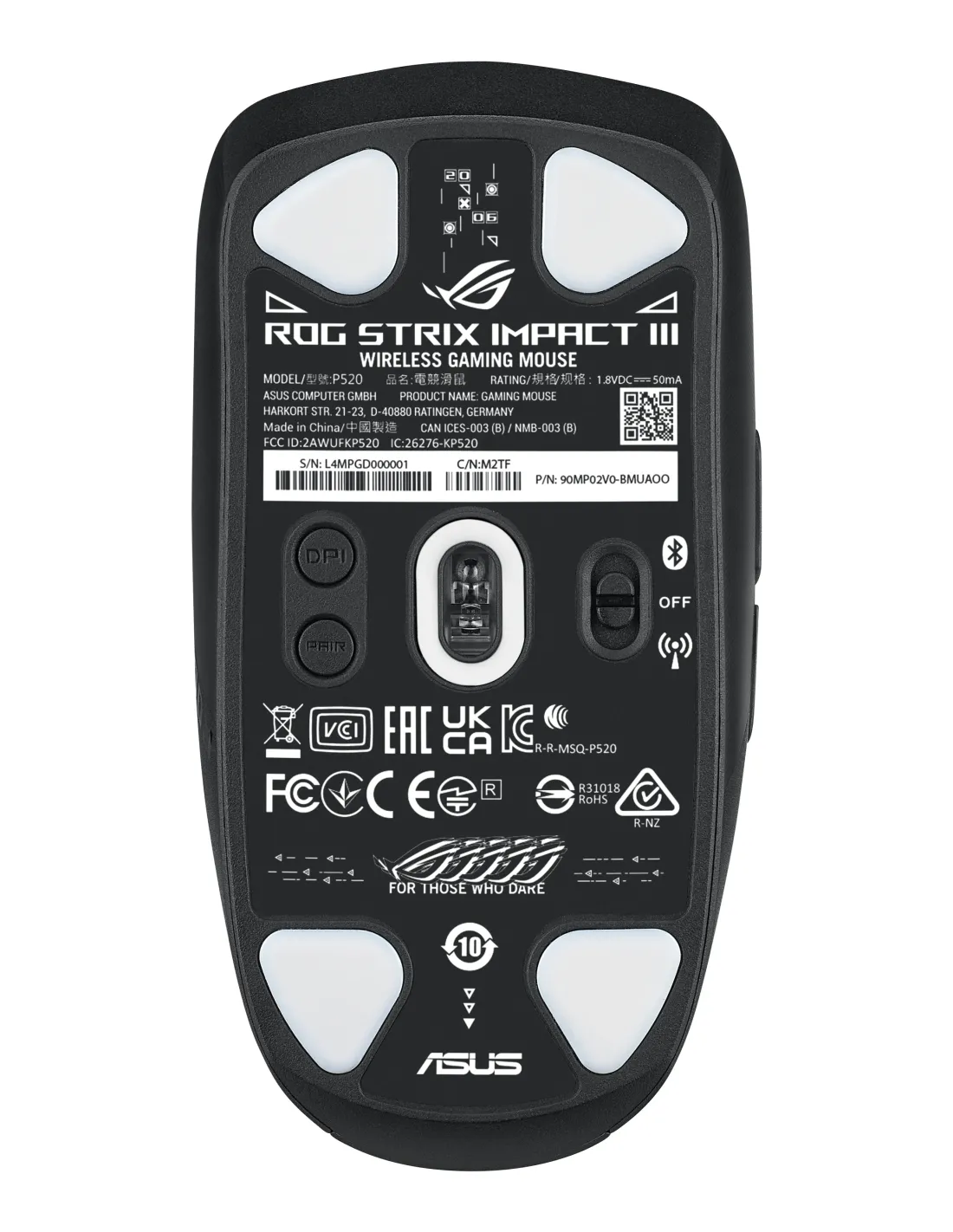 ASUS ROG Strix Impact III Wireless. Fattore di forma: Ambidestro. Tecnologia di rilevamento del movimento: Ottico, Interfaccia dispositivo: RF senza fili + Bluetooth, Risoluzione movimento: 36000 DPI, Tipo di pulsanti: Tasti premuti, Numero di tasti: 6, Tipo di scorimmento: Rotella, Accelerazione (max): 50 G. colore d'illuminazione: Multi. Alimentazione: Batterie. Colore del prodotto: Nero
