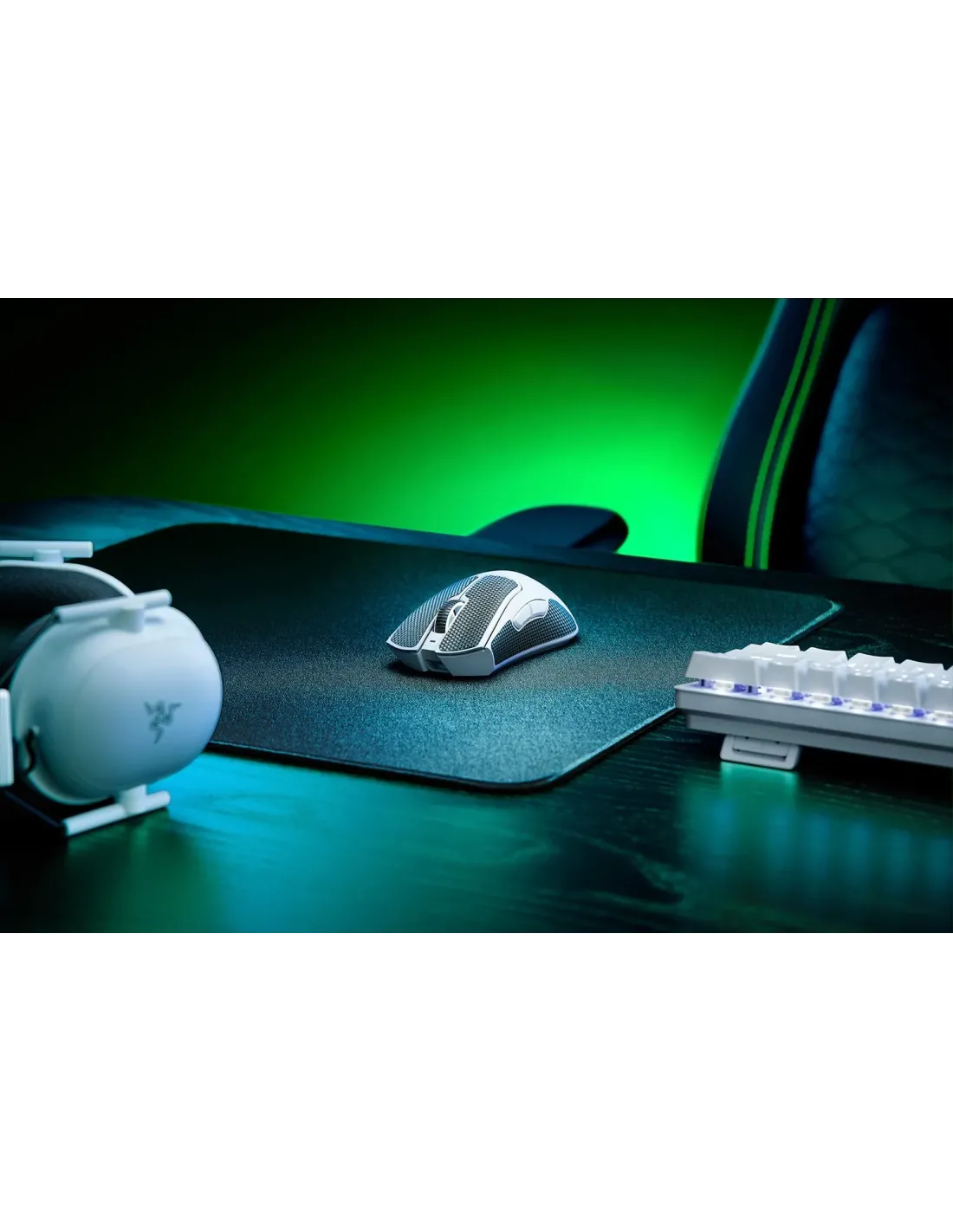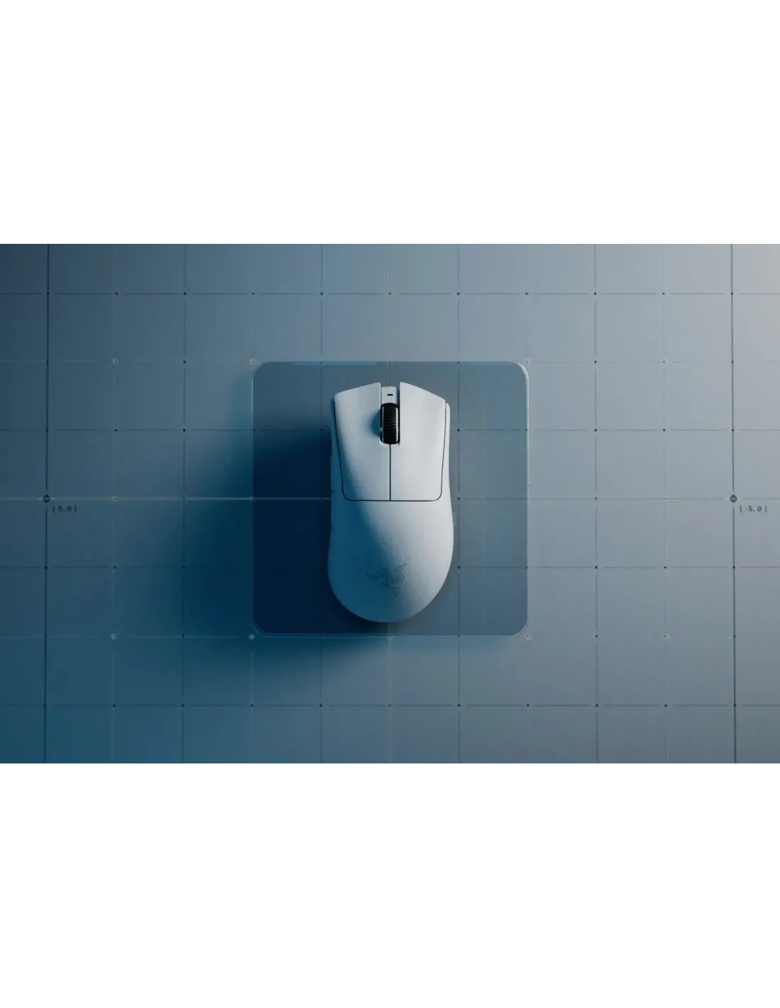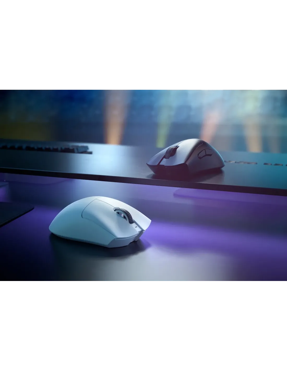 Razer DeathAdder V3 Pro. Fattore di forma: Mano destra. Tecnologia di rilevamento del movimento: Ottico, Interfaccia dispositivo: RF Wireless + USB Type-C, Risoluzione movimento: 30000 DPI, Tipo di pulsanti: Tasti premuti, Tipo di scorimmento: Rotella, Accelerazione (max): 70 G. Alimentazione: Batterie/Cavo. Colore del prodotto: Bianco
