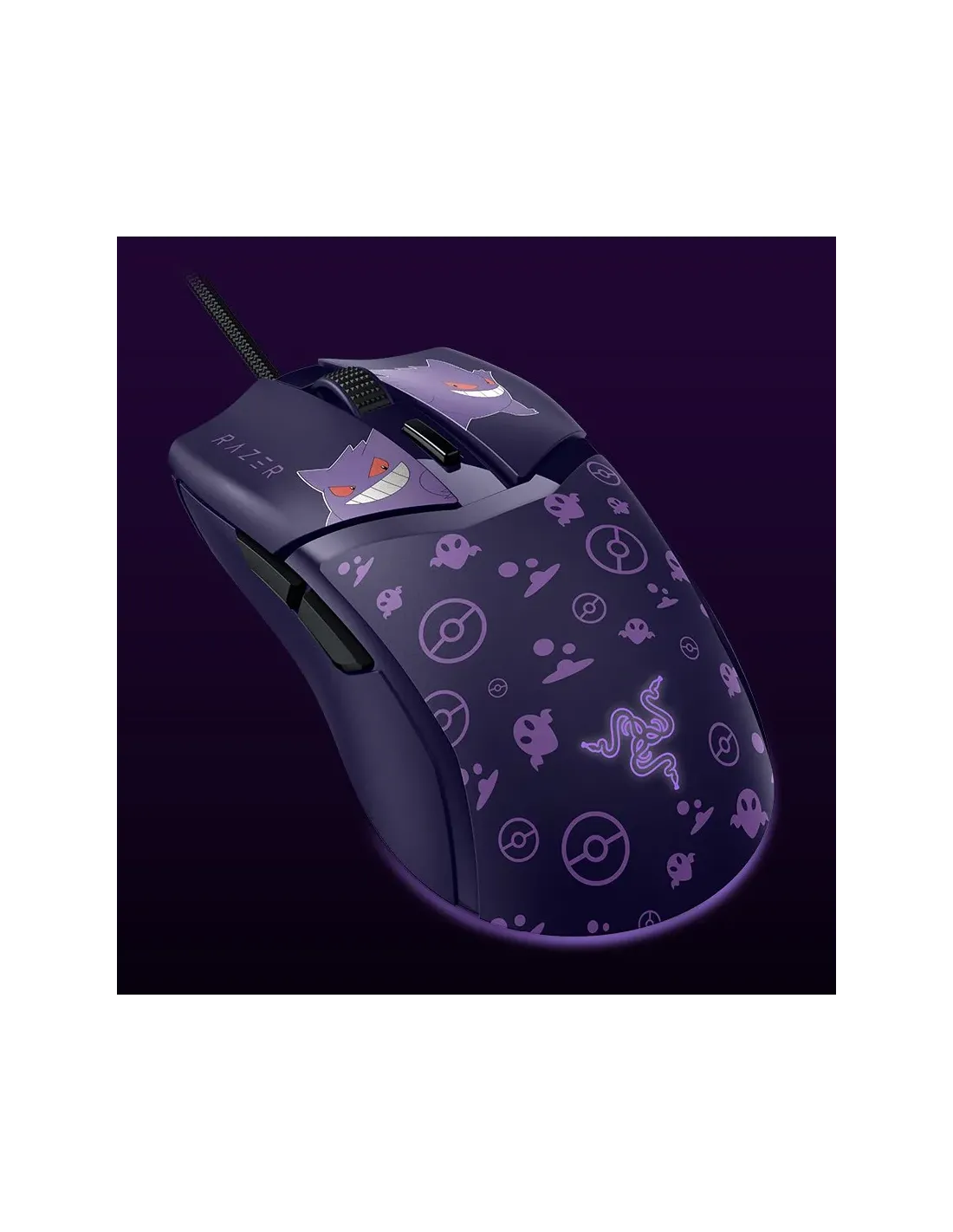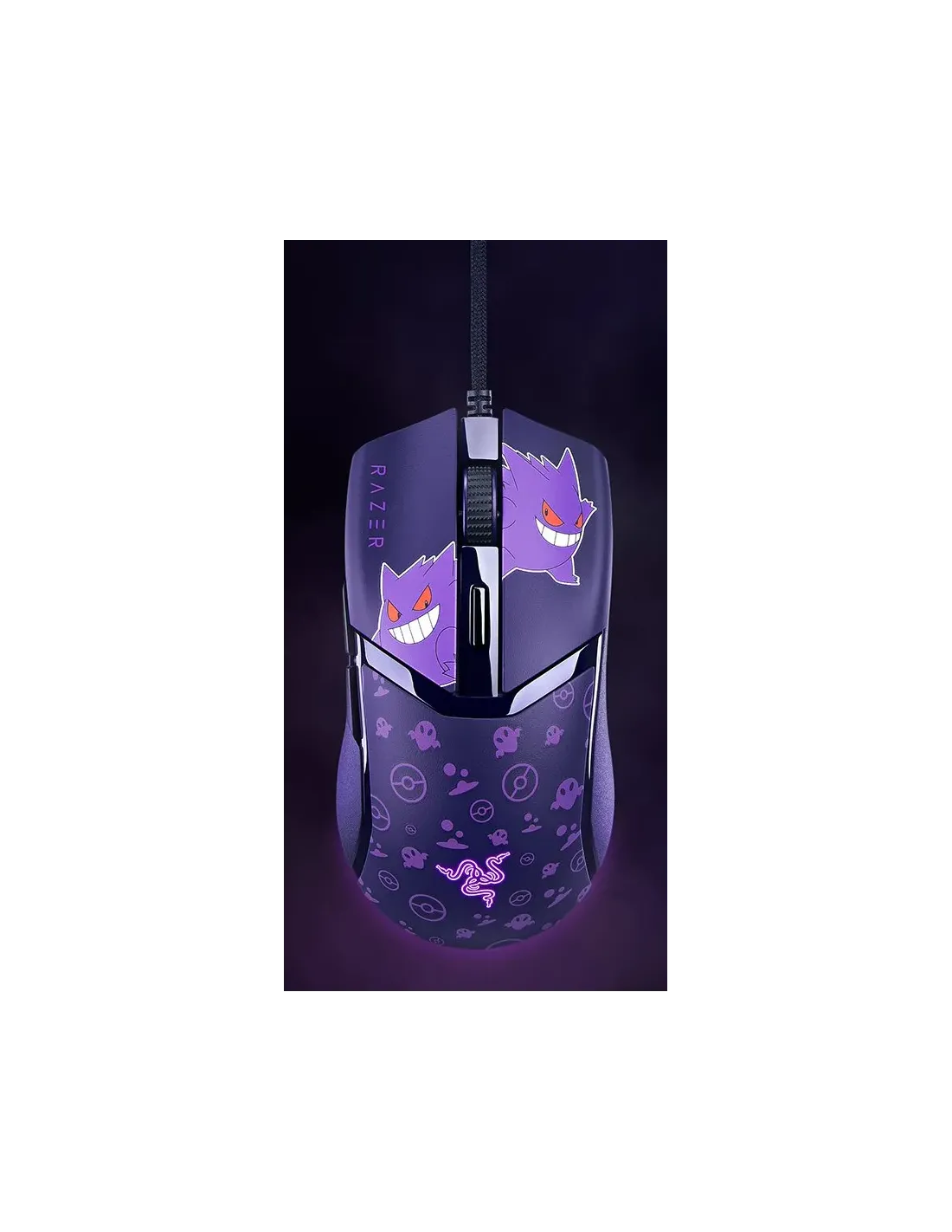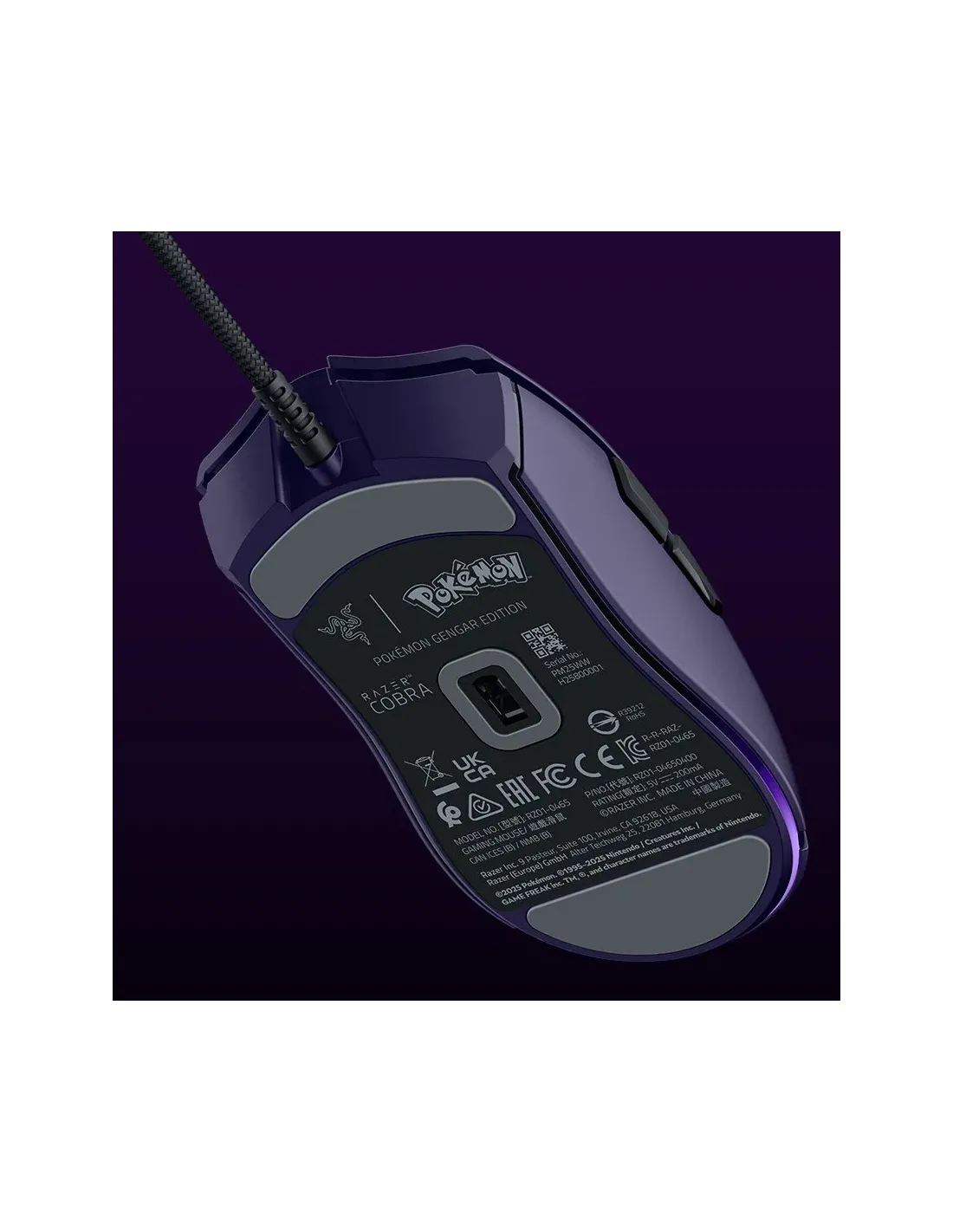 Razer Cobra Gengar Edition. Fattore di forma: Mano destra. Tecnologia di rilevamento del movimento: Ottico, Interfaccia dispositivo: USB tipo A, Risoluzione movimento: 8500 DPI, Tipo di pulsanti: Tasti premuti, Numero di tasti: 6, Tipo di scorimmento: Rotella, Accelerazione (max): 35 G. colore d'illuminazione: Multi. Alimentazione: Cavo. Funziona su tutte le superfici. Colore del prodotto: Viola