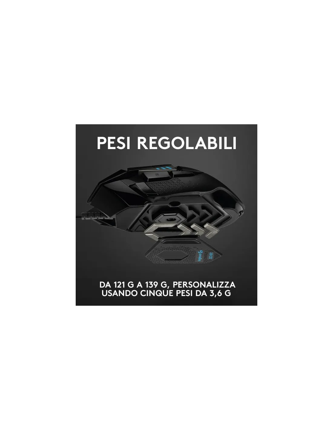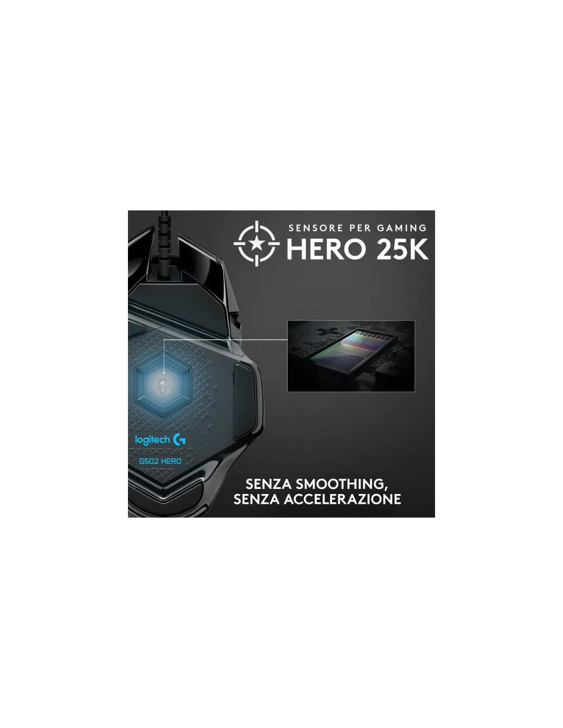 G502 HERO include un sensore ottico avanzato per la massima precisione di puntamento, illuminazione RGB personalizzabile, profili di gioco personalizzati, da 200 a 25.600 DPI*, e pesi riposizionabili.