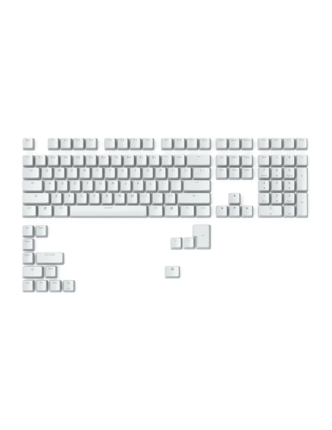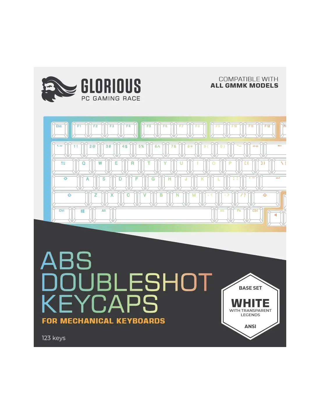 Glorious Gaming Doubleshot Keycaps V2. Tipo di prodotto: Coperchio per tastiera, Tipo di dispositivo: Tastiera, Compatibilità marca: Glorious PC Gaming Race, Compatibilità: GMMK, Materiali: Acrilonitrile butadiene stirene (ABS), Colore del prodotto: Bianco