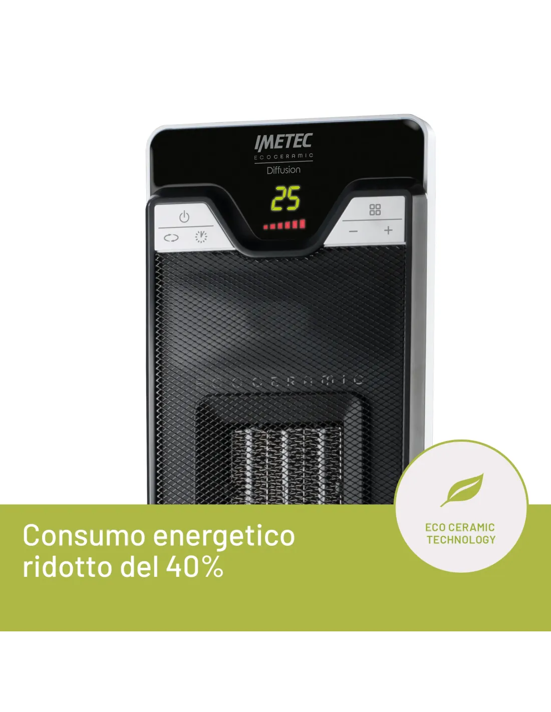 La tecnologia ceramica consente di riscaldare l’ambiente in modo efficiente riducendo i consumi e risparmiando fino al 40% di energia elettrica rispetto al termoventilatore con tecnologia tradizionale da 2000 W. Test di laboratorio interni dimostrano che l’aria convogliata dal termoventilatore Imetec Eco Ceramic, a una distanza di 65 cm con un consumo medio di 1200 W, raggiunge la stessa temperatura del termoventilatore con tecnologia tradizionale di Imetec (type S0901) da 2000 W.