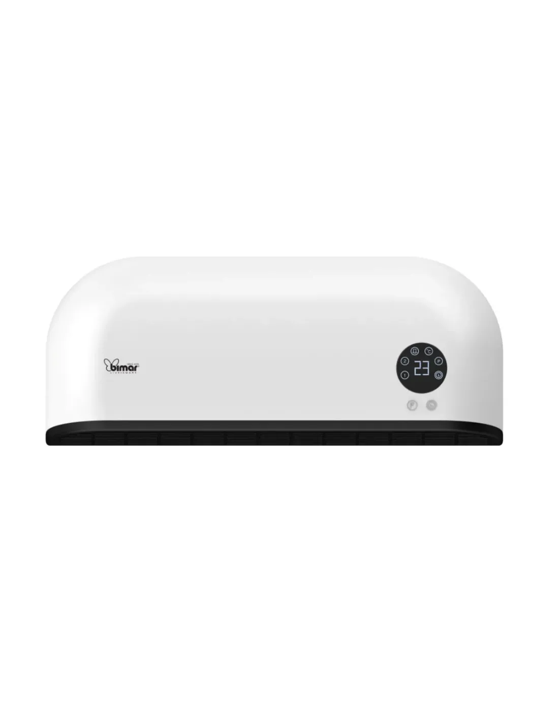 Bimar HP093. Tipo: Riscaldatore ambiente elettrico con ventilatore, Tipologia elemento riscaldante: Ceramica, Durata massima del timer: 12 h. Adatto per: Interno, Opzioni di posizionamento: Parete, Colore del prodotto: Nero, Bianco. Potenza termica: 2000 W, Potenza termica (min): 1000 W, Tipo di controllo del termostato: Digitale. Tensione di ingresso AC: 220 - 240 V, Frequenza di ingresso AC: 50/60 Hz. Larghezza: 456 mm, Profondità: 188 mm, Altezza: 130 mm