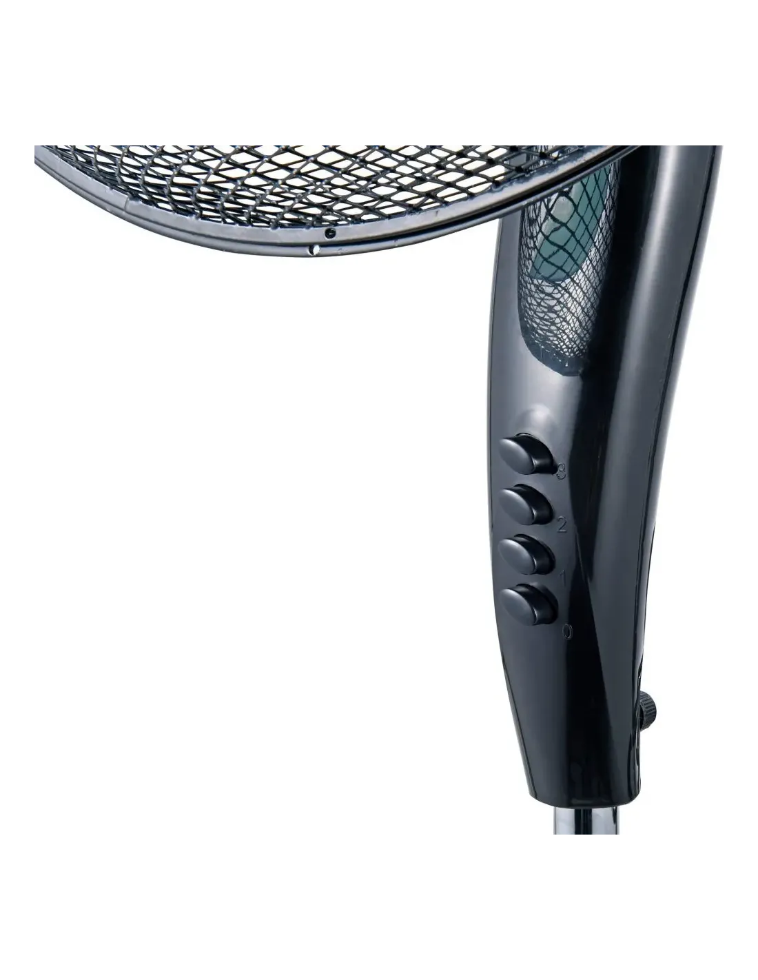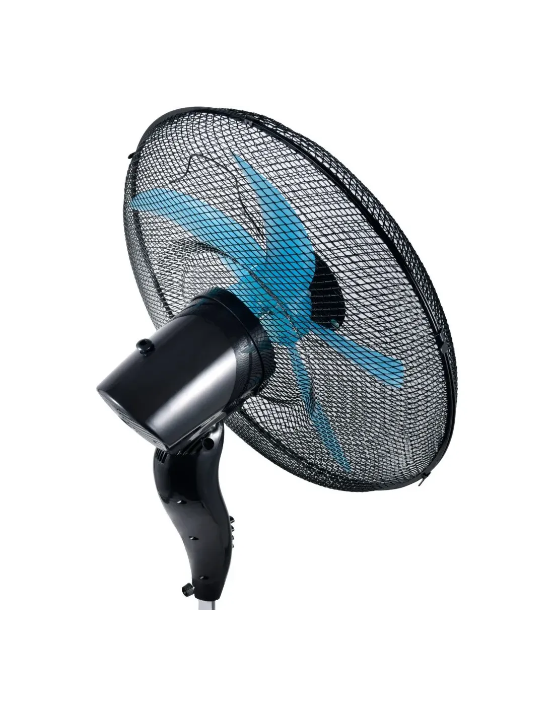 Ventilatore a piantana Ø 50 cm, pala colorata in semitrasparenza turchese, griglia a nido d’ape, oscillazione laterale automatica. Potenza 70 W, 3 velocità, base tonda, look total black.