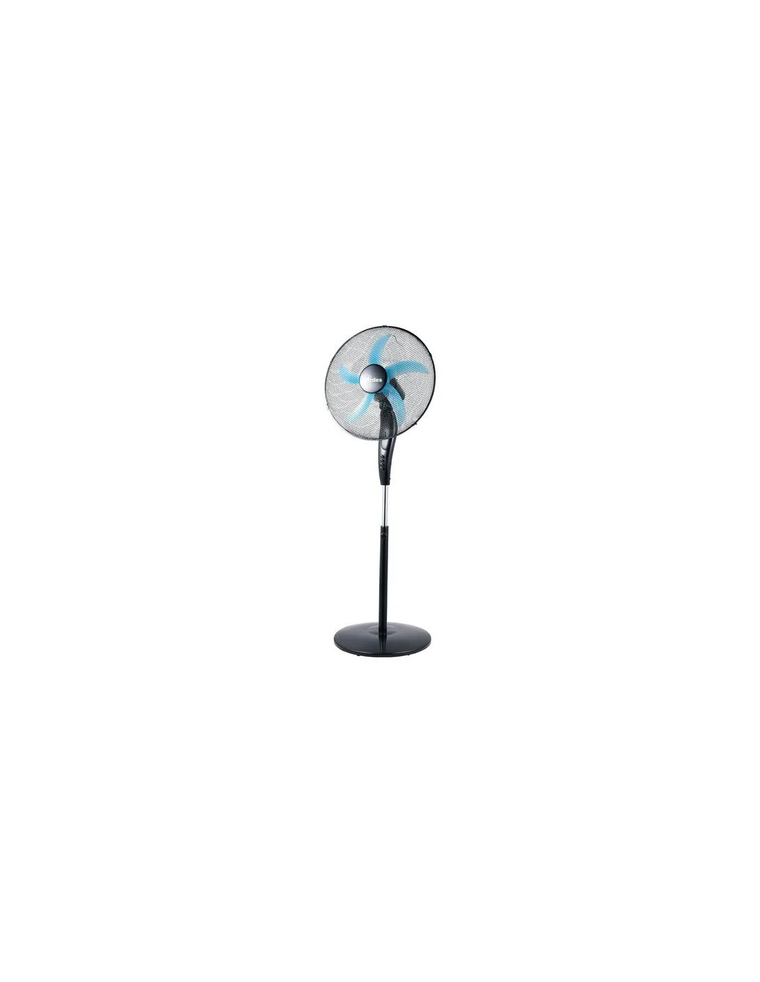 Ventilatore a piantana Ø 50 cm, pala colorata in semitrasparenza turchese, griglia a nido d’ape, oscillazione laterale automatica. Potenza 70 W, 3 velocità, base tonda, look total black.