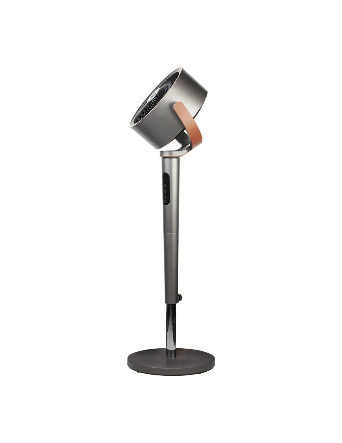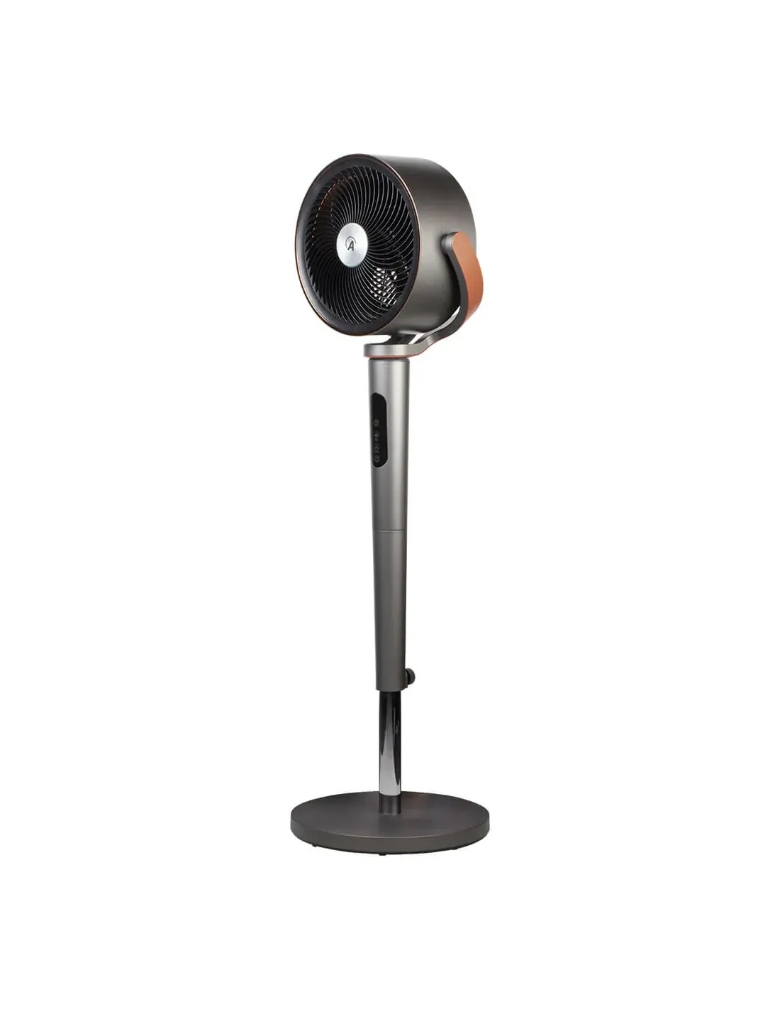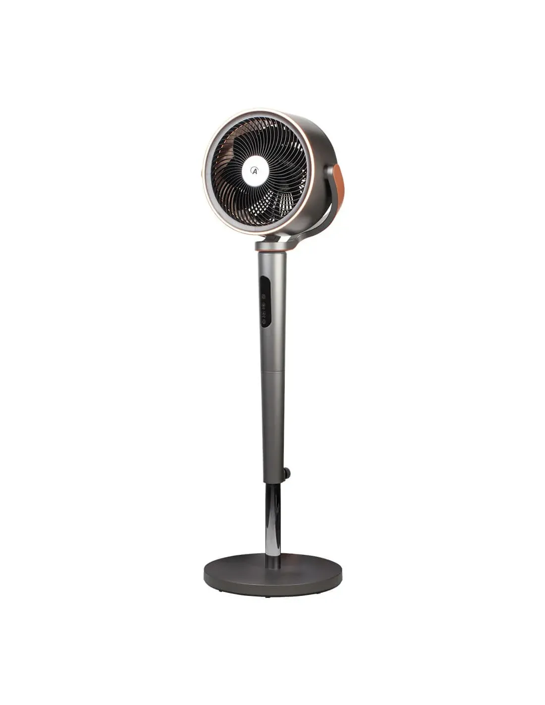 Circolatore d’aria con telecomando e luce ambientale. Potente flusso d’aria. Altezza regolabile 95-115 cm. 12 velocità, timer 12 ore e pannello comandi touch. Oscillazione 3D: oscillazione orizzontale e verticale automatica. Testa inclinabile fino a 90° per una migliore circolazione dell’aria all’interno degli ambienti. Ionizzatore e diffusore di essenze. Finiture in similpelle e inserti color rame.