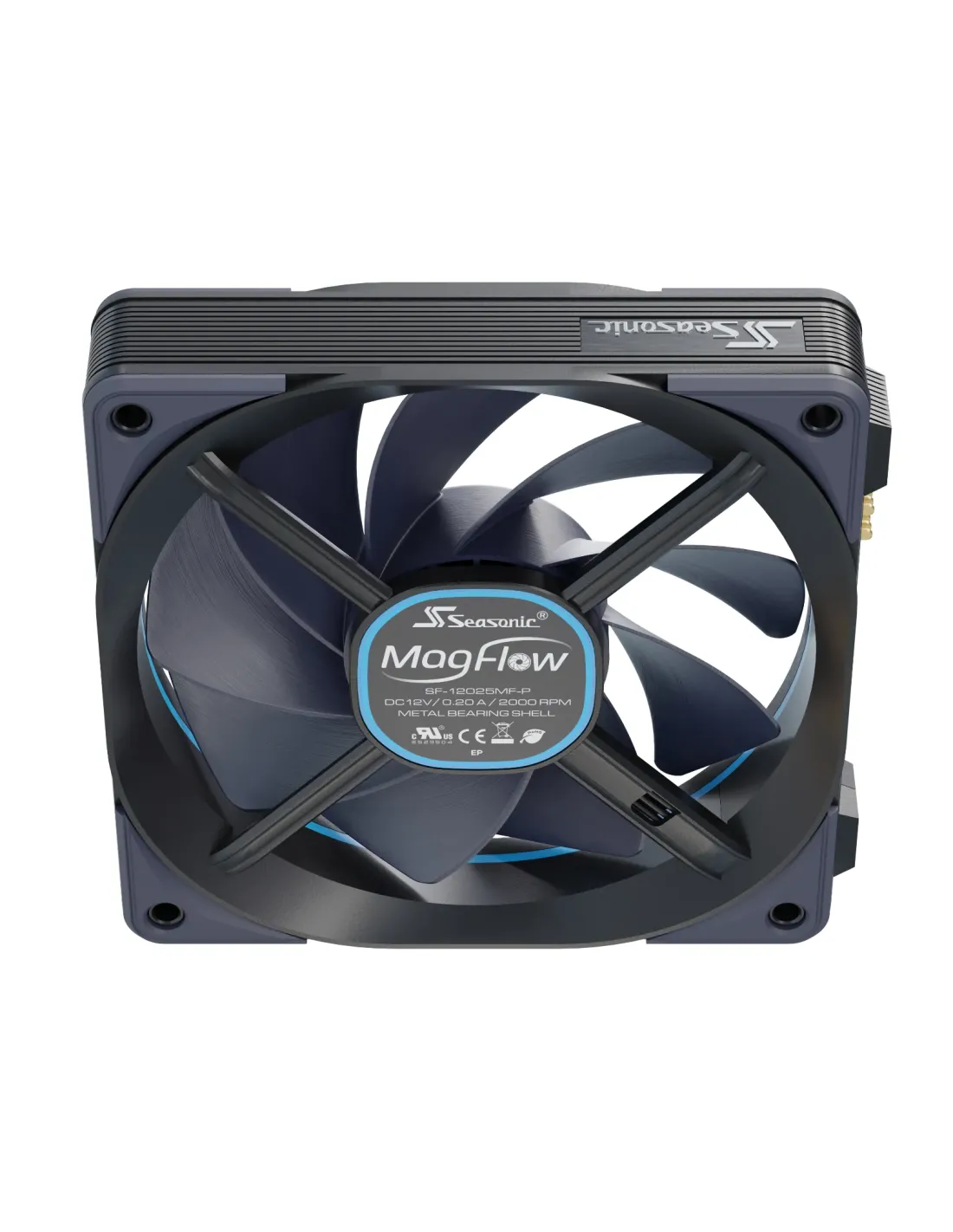 Seasonic MagFlow 3-Fan Kit. Tipo: Ventilatore, Diametro del ventilatore: 12 cm, Velocità (minima) di rotazione: 600 Giri/min, Velocità (massima) di rotazione: 2000 Giri/min, pressione dell'aria massima: 2,61 mmH2O, Tipo di cuscinetto: Cuscinetto fluido dinamico (FDB). Voltaggio: 12 V. Larghezza: 124,2 mm, Profondità: 26,6 mm, Altezza: 120,4 mm. Colore del prodotto: Nero
