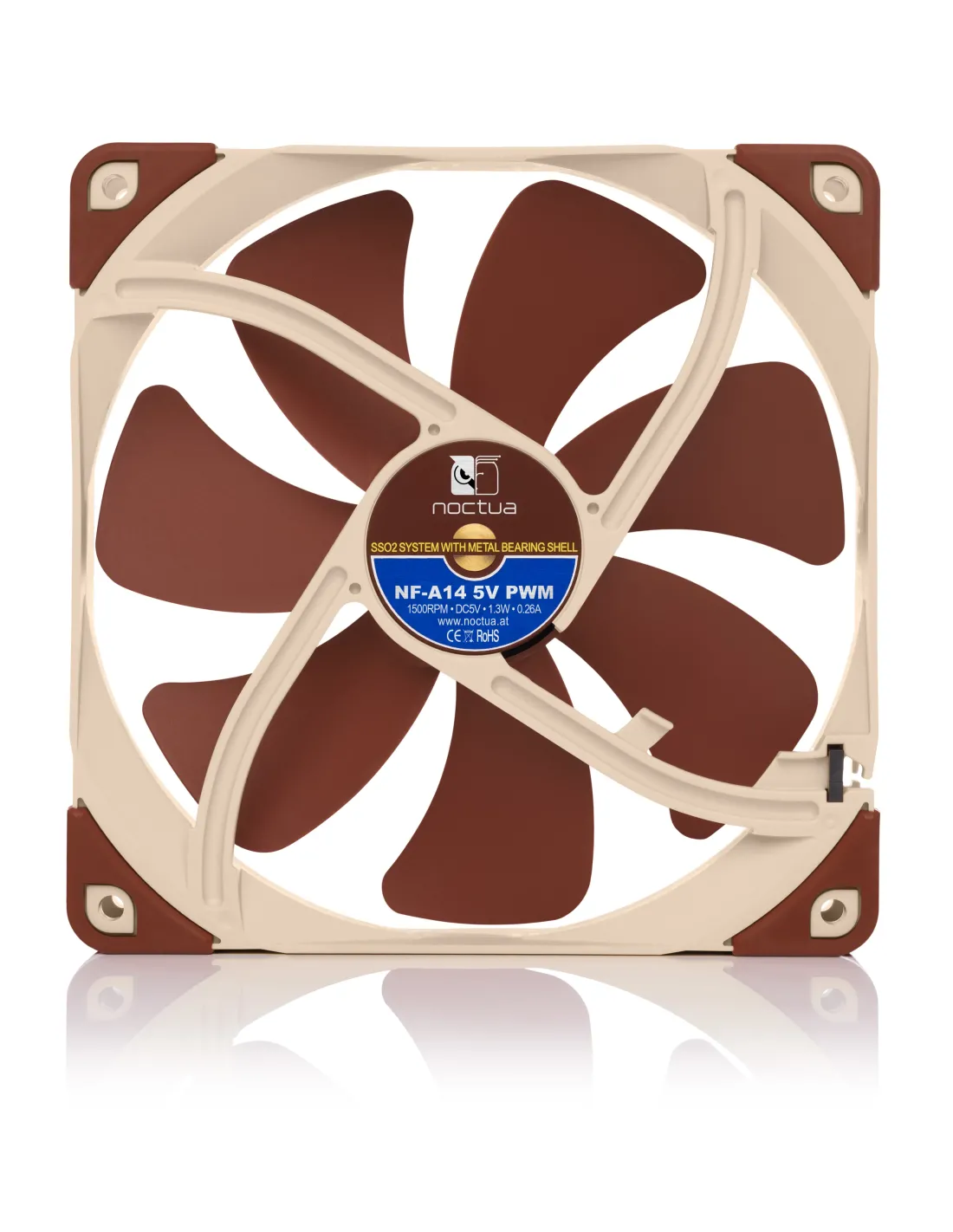 Noctua NF-A14. Tipo: Ventilatore, Diametro del ventilatore: 14 cm, Velocità (minima) di rotazione: 300 Giri/min, Velocità (massima) di rotazione: 1500 Giri/min, Flusso d'aria: 140,2 m³/h, pressione dell'aria massima: 2,08 mmH2O, Tipo di cuscinetto: Self-Stabilising Oil-pressure Bearing (SSO). Voltaggio: 5 V. Larghezza: 140 mm, Profondità: 25 mm, Altezza: 140 mm. Colore del prodotto: Beige, Marrone