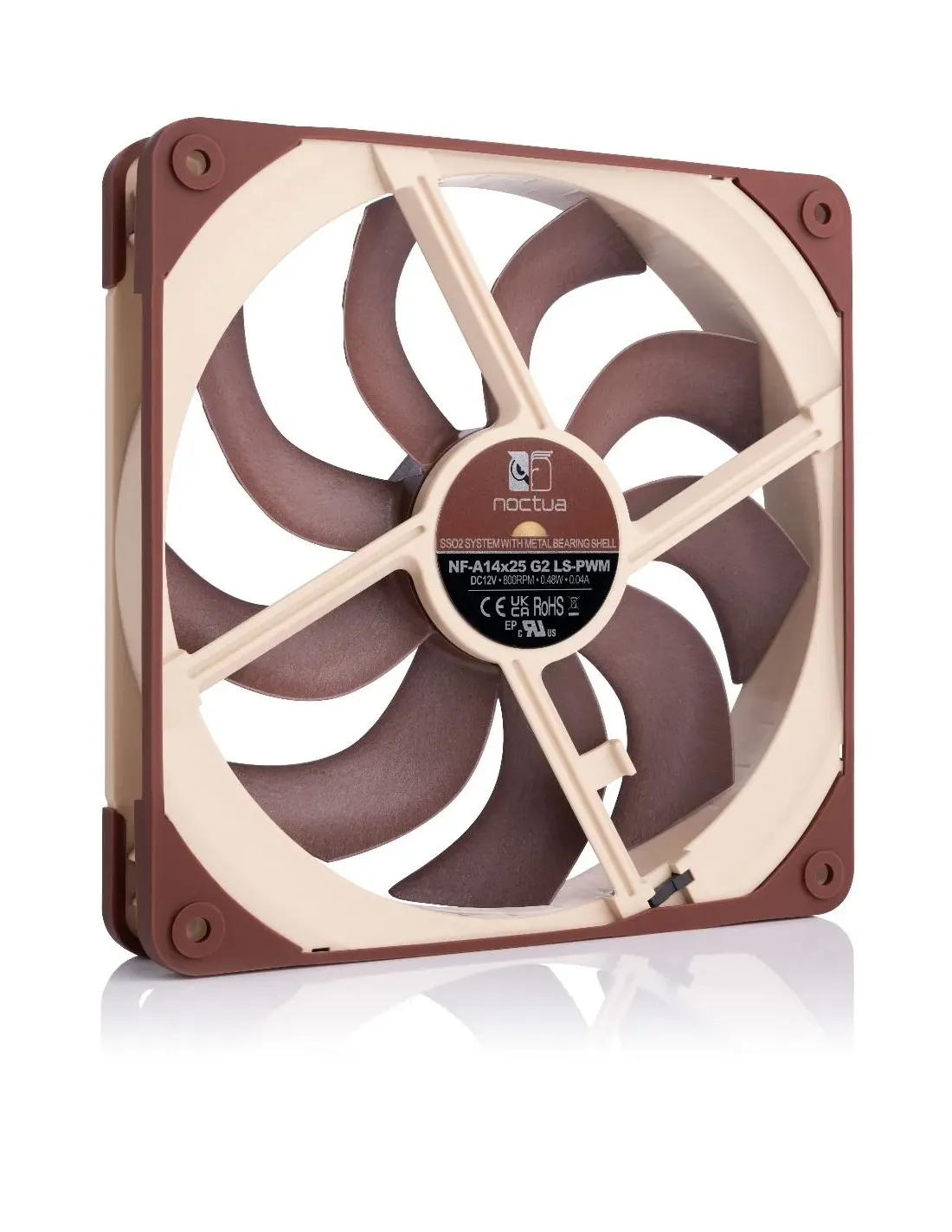 Noctua NF-A14X25 G2 LS-PWM. Tipo: Raffreddatore d'aria, Diametro del ventilatore: 14 cm, Velocità (massima) di rotazione: 800 Giri/min, Flusso d'aria: 81,6 m³/h, Tipo di cuscinetto: Self-Stabilising Oil-pressure (SSO) bearing. Colore del prodotto: Beige, Marrone