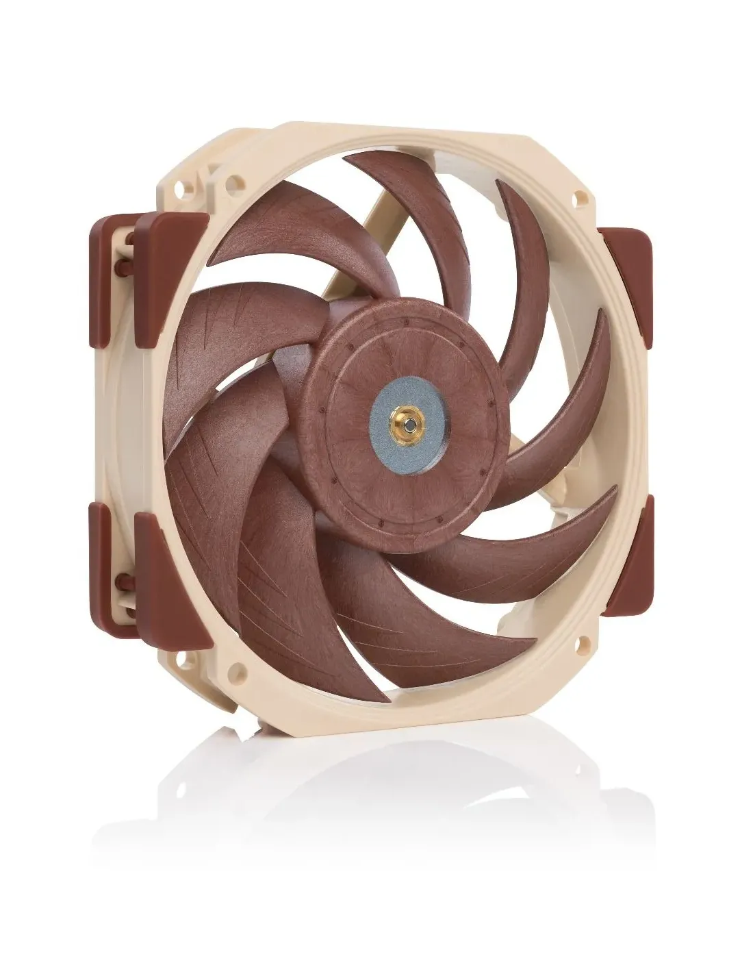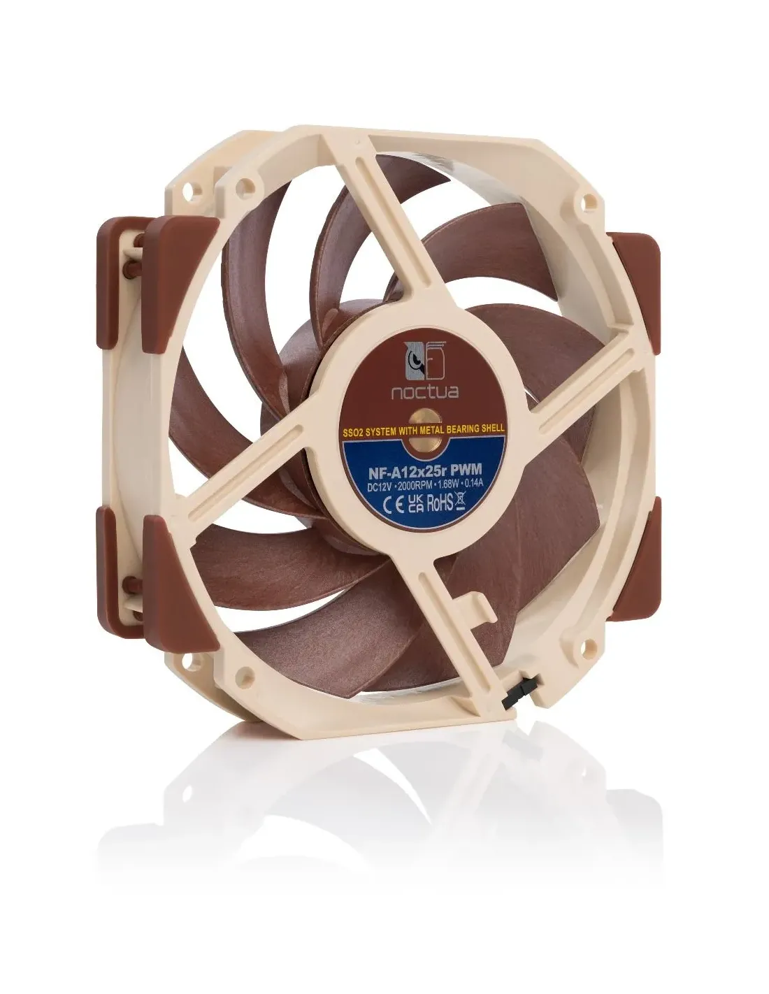 Noctua NF-A12X25R PWM. Tipo: Ventilatore, Diametro del ventilatore: 12 cm, Velocità (minima) di rotazione: 450 Giri/min, Velocità (massima) di rotazione: 2000 Giri/min, Flusso d'aria: 102,1 m³/h, pressiore dell'aria minima: 1,65 mmH2O, pressione dell'aria massima: 2,34 mmH2O, Tipo di cuscinetto: Self-Stabilising Oil-pressure Bearing (SSO). Voltaggio: 12 V. Larghezza: 120 mm, Profondità: 25 mm, Altezza: 120 mm. Colore del prodotto: Beige, Marrone