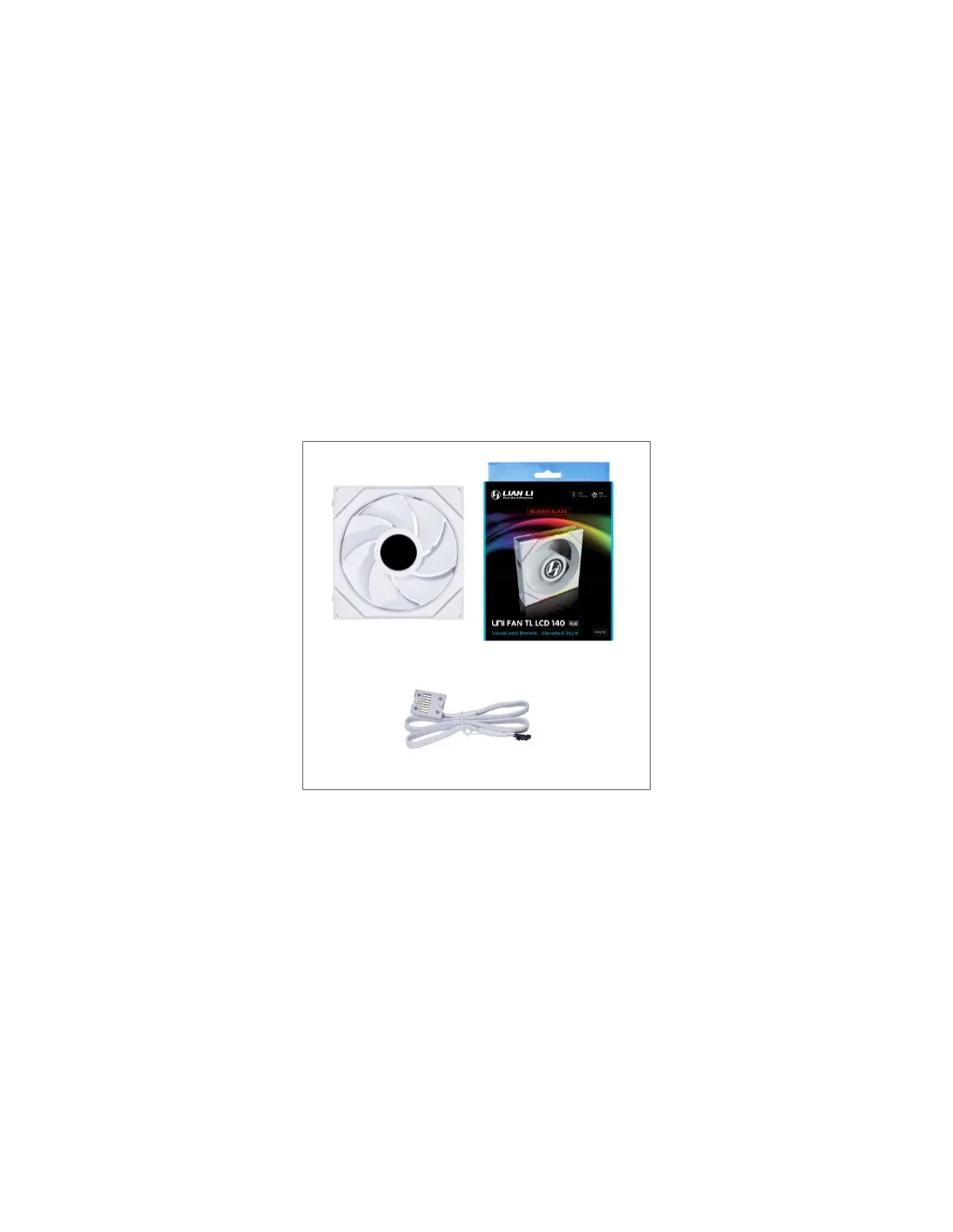 Lian Li Uni Fan TL LCD. Tipo: Ventilatore, Diametro del ventilatore: 14 cm, Velocità (minima) di rotazione: 350 Giri/min, Velocità (massima) di rotazione: 1600 Giri/min, pressione dell'aria massima: 3,1 mmH2O, Tipo di cuscinetto: Cuscinetto fluido dinamico (FDB). Voltaggio: 12 V. Larghezza: 144 mm, Profondità: 140 mm, Altezza: 28 mm. Colore del prodotto: Bianco