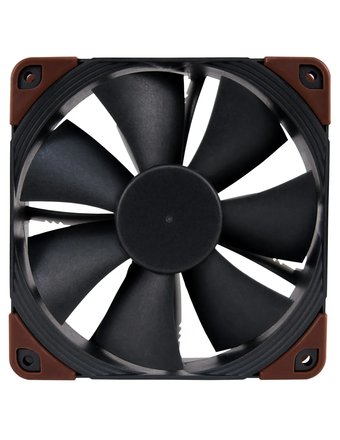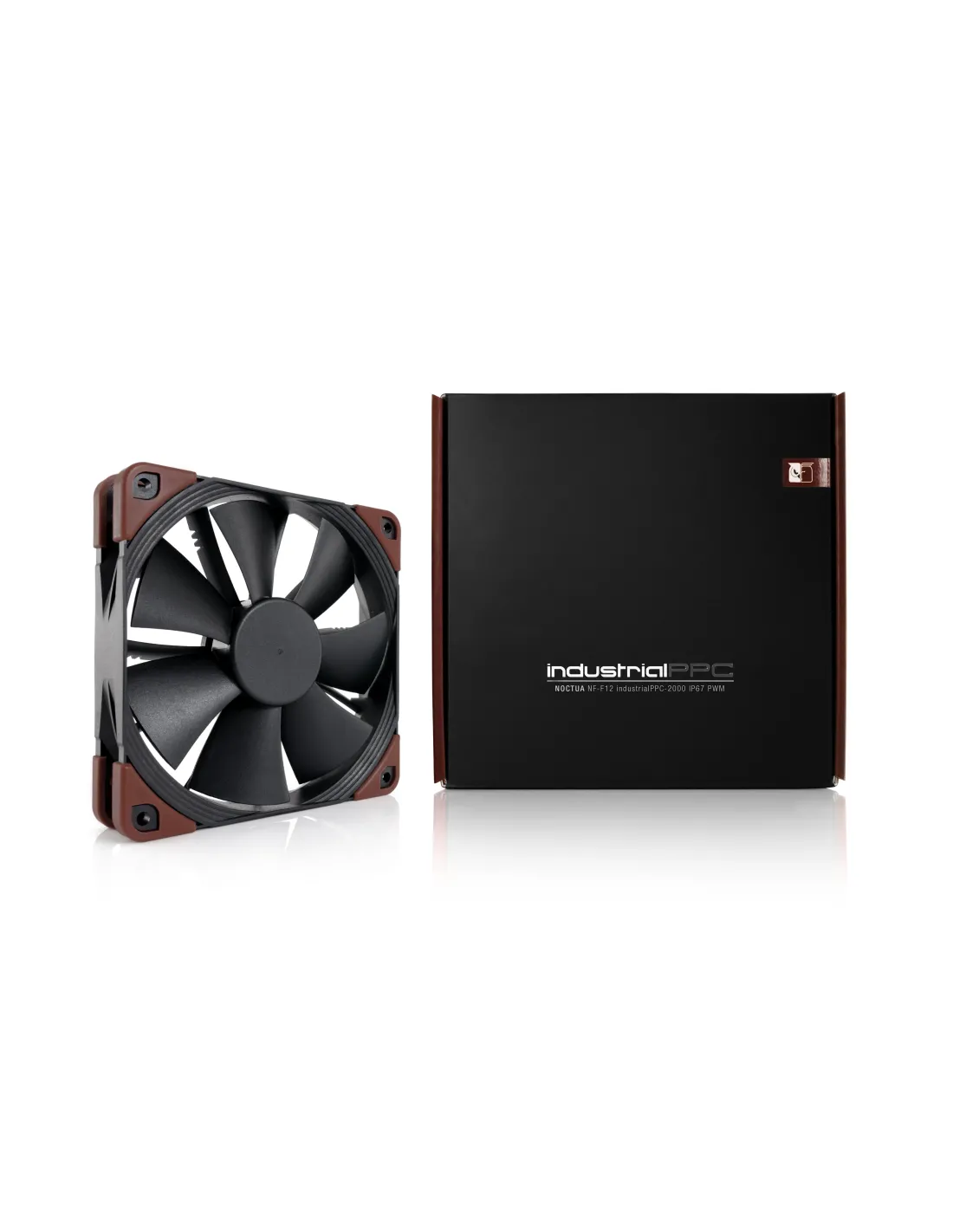 Noctua NF-F12 INDUSTRIALPPC-2000 IP67 PWM. Tipo: Ventilatore, Diametro del ventilatore: 12 cm, Velocità (minima) di rotazione: 450 Giri/min, Velocità (massima) di rotazione: 2000 Giri/min, Flusso d'aria: 121,8 m³/h, pressione dell'aria massima: 3,94 mmH2O, Tipo di cuscinetto: Self-Stabilising Oil-pressure Bearing (SSO). Voltaggio: 12 V. Larghezza: 120 mm, Profondità: 25 mm, Altezza: 120 mm. Colore del prodotto: Nero, Marrone