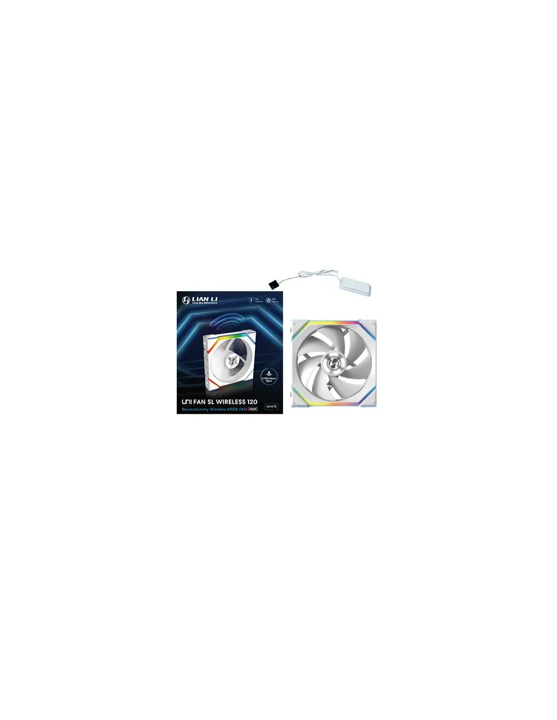 Lian Li UNI FAN SL Wireless 120. Tipo: Ventilatore, Diametro del ventilatore: 12 cm, pressione dell'aria massima: 2,44 mmH2O, Tipo di cuscinetto: Cuscinetto fluido dinamico (FDB). Voltaggio: 5 - 12 V. Colore del prodotto: Bianco