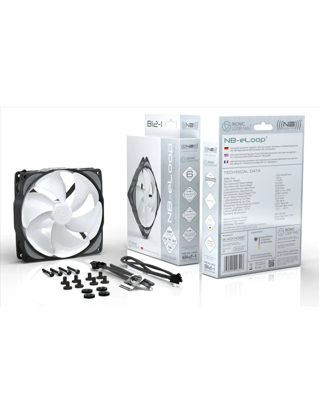 Noiseblocker B12-PS-BL. Tipo: Ventilatore, Diametro del ventilatore: 12 cm, Velocità (minima) di rotazione: 400 Giri/min, Velocità (massima) di rotazione: 1500 Giri/min, Flusso d'aria: 98,7 m³/h, pressione dell'aria massima: 1,475 mmH2O. Voltaggio: 3.9 - 13.8 V. Larghezza: 120 mm, Profondità: 25 mm, Altezza: 120 mm. Colore del prodotto: Nero