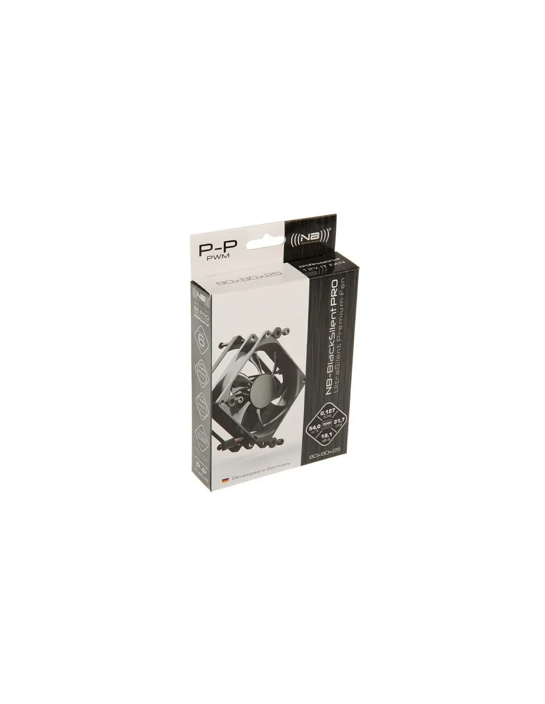 Noiseblocker BlackSilentPro P-P. Tipo: Ventilatore, Diametro del ventilatore: 8 cm, Velocità (minima) di rotazione: 500 Giri/min, Velocità (massima) di rotazione: 2000 Giri/min, Flusso d'aria: 54 m³/h. Voltaggio: 12 V. Larghezza: 80 mm, Profondità: 80 mm, Altezza: 25 mm. Colore del prodotto: Nero