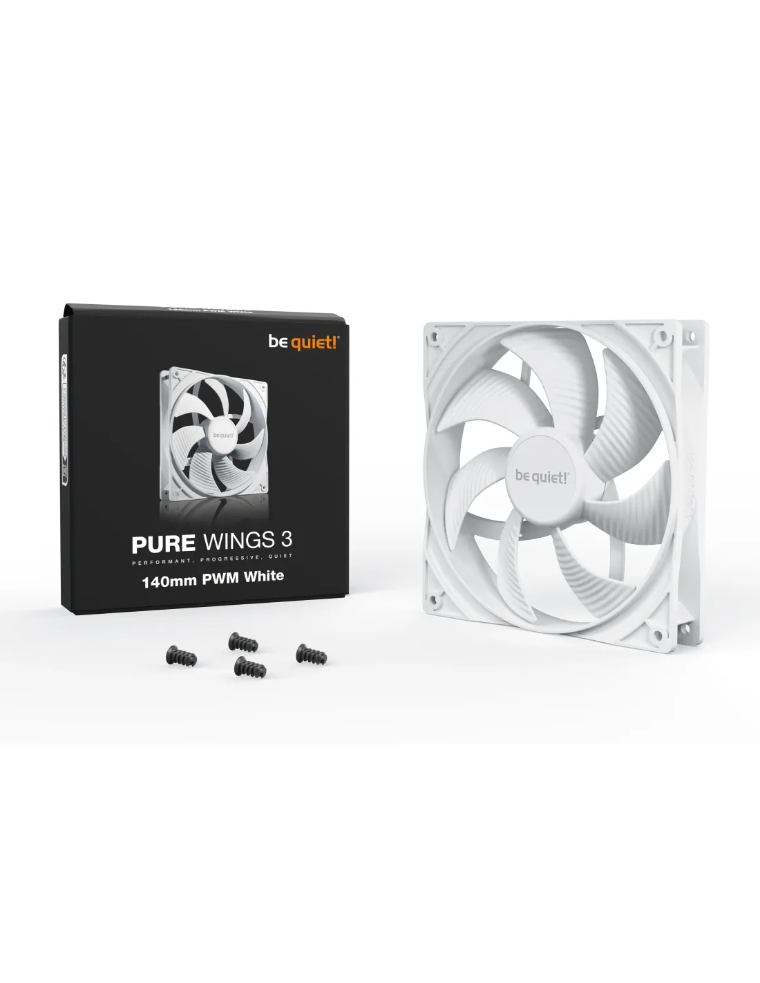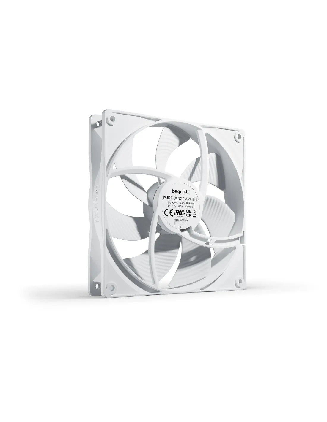 be quiet! Pure Wings 3 140mm PWM White. Tipo: Ventilatore, Diametro del ventilatore: 14 cm, Velocità (massima) di rotazione: 1200 Giri/min, Flusso d'aria: 97,5 m³/h, pressione dell'aria massima: 0,96 mmH2O, Tipo di cuscinetto: Cuscinetto da strisciamento. Voltaggio: 5 - 13.2 V. Larghezza: 140 mm, Profondità: 140 mm, Altezza: 25 mm. Colore del prodotto: Bianco