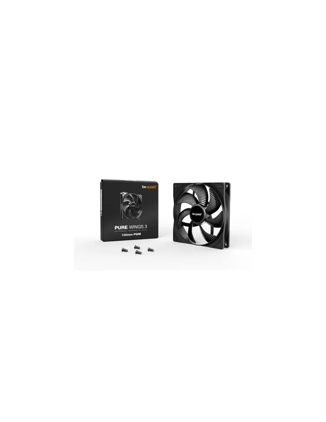 be quiet! Pure Wings 3 140mm PWM. Tipo: Ventilatore, Diametro del ventilatore: 14 cm, Velocità (massima) di rotazione: 1200 Giri/min, Flusso d'aria: 97,5 m³/h, pressione dell'aria massima: 0,96 mmH2O. Voltaggio: 5 - 13.2 V. Larghezza: 140 mm, Profondità: 140 mm, Altezza: 25 mm. Colore del prodotto: Nero