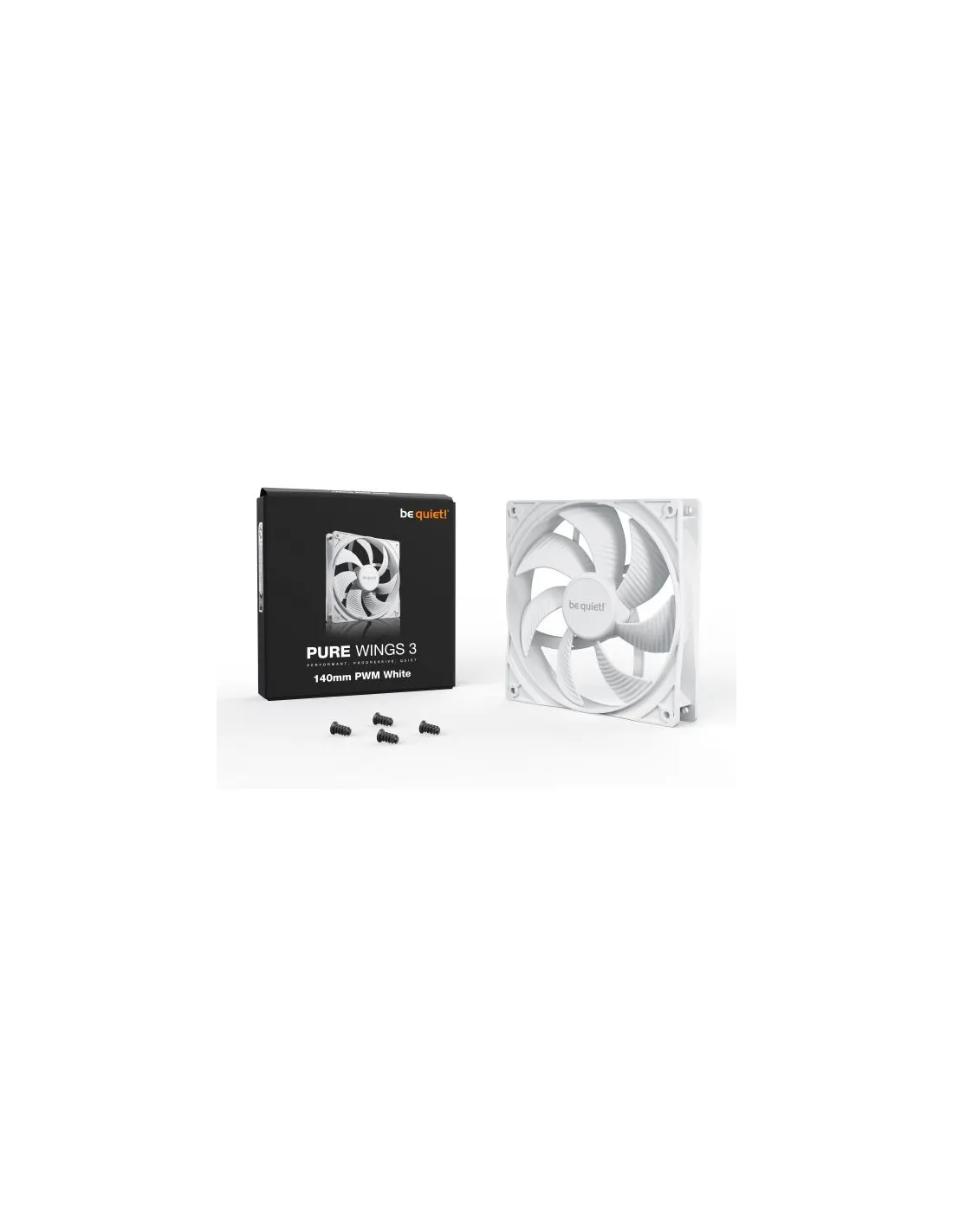 be quiet! Pure Wings 3 140mm PWM White. Tipo: Ventilatore, Diametro del ventilatore: 14 cm, Velocità (massima) di rotazione: 1200 Giri/min, Flusso d'aria: 97,5 m³/h, pressione dell'aria massima: 0,96 mmH2O, Tipo di cuscinetto: Cuscinetto da strisciamento. Voltaggio: 5 - 13.2 V. Larghezza: 140 mm, Profondità: 140 mm, Altezza: 25 mm. Colore del prodotto: Bianco